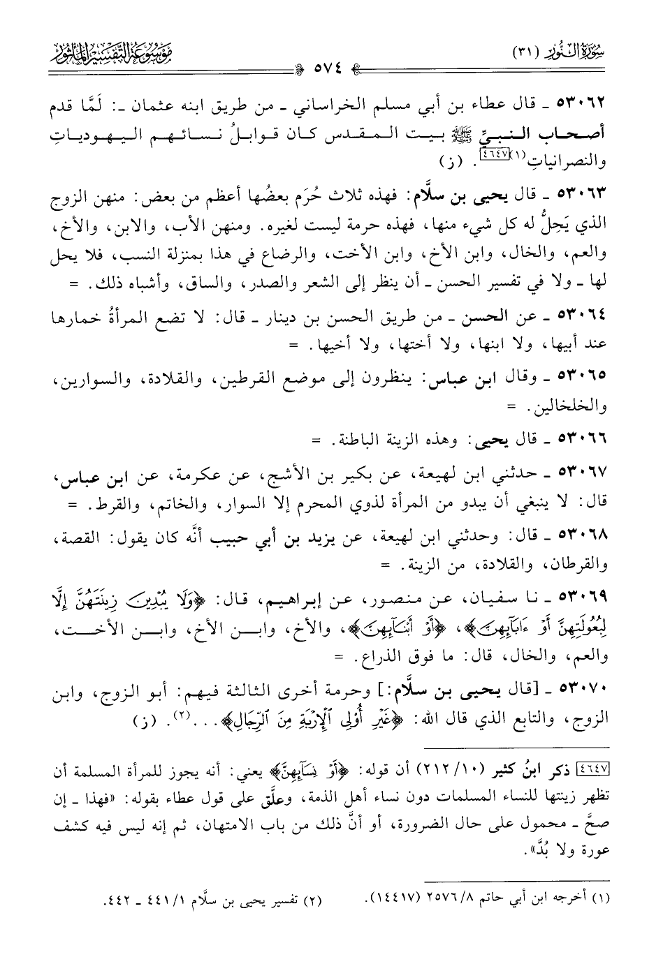 ٥٣٠٦٩ - نا سفيان، عن منصور، عن إبراهيم، قال: {ولا يبدين زينتهن إلا لبعولتهن أو آبائهن}، {أو أبنائهن}، والأخ، وابن الأخ، وابن الأخت، والعم، والخال، قال: ما فوق الذراع. =