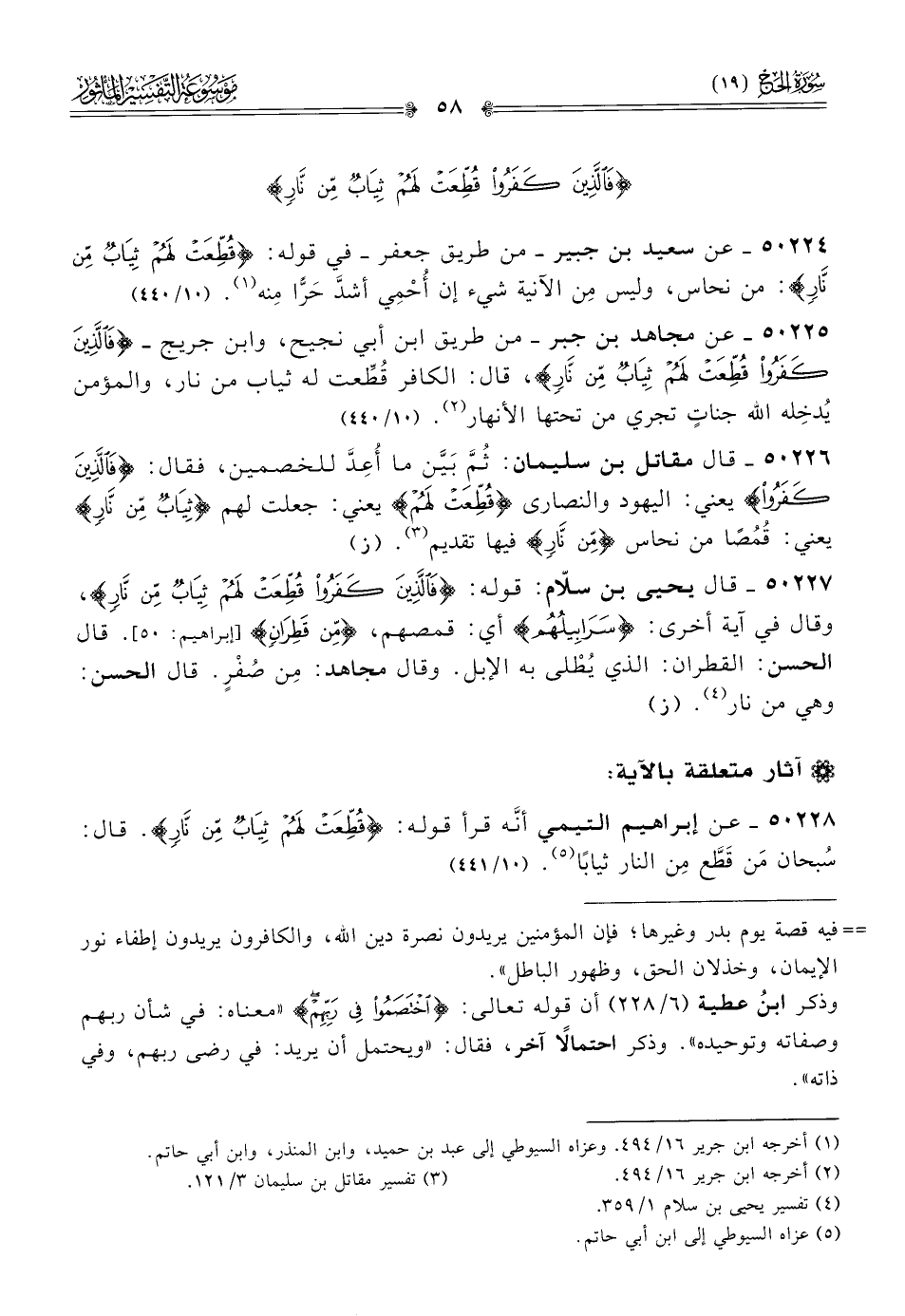 ٥٠٢٢٥ - عن مجاهد بن جبر -من طريق ابن أبي نجيح، وابن جريج- {فالذين كفروا قطعت لهم ثياب من نار}، قال: الكافر قُطِّعت له ثياب من نار، والمؤمن يُدخِله الله جناتٍ تجري من تحتها الأنهار (¬٢). (١٠/ ٤٤٠)