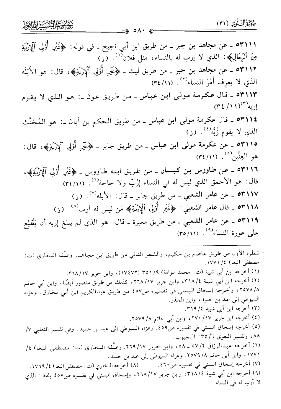 ٥٣١١٥ - عن عكرمة مولى ابن عباس -من طريق جابر- {غير أولي الأربة}، قال: هو العِنِّين (¬٥). (١١/ ٣٤)