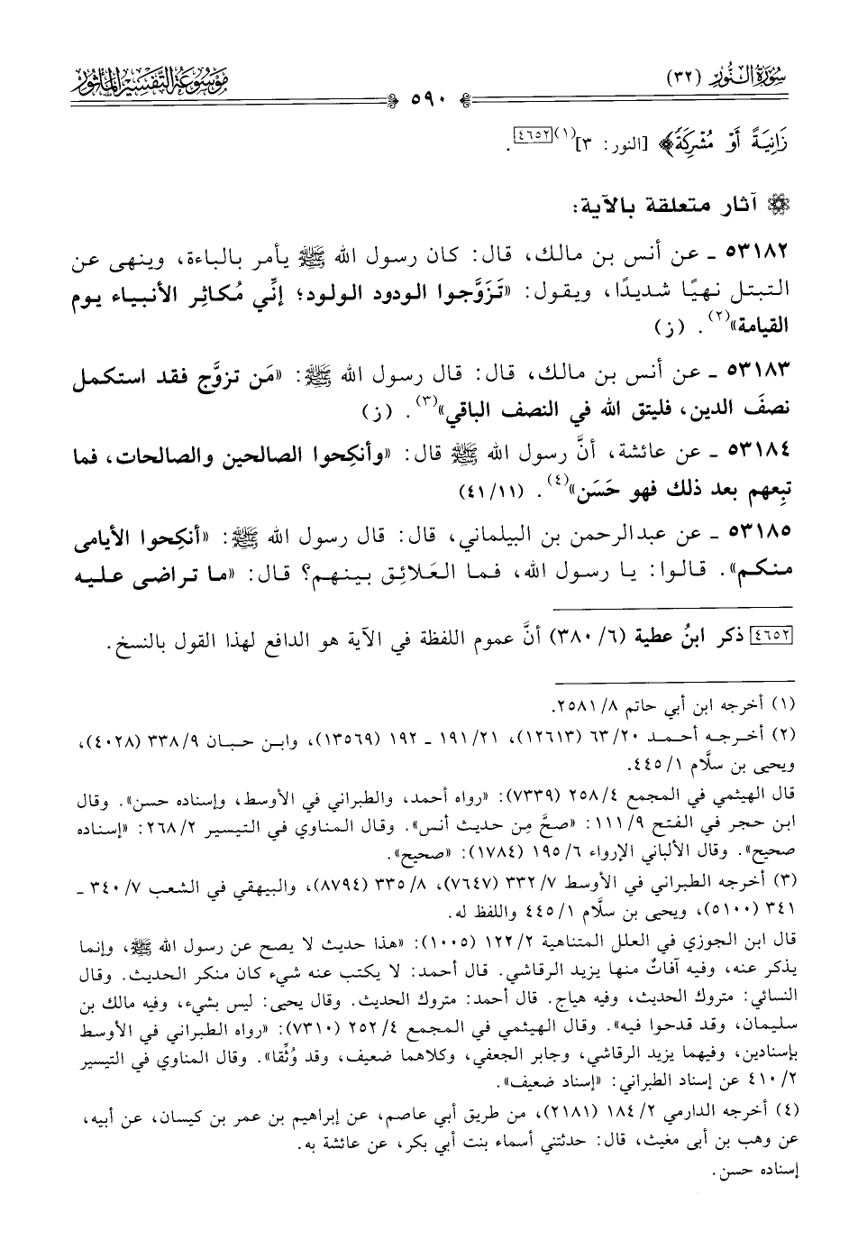 ٥٣١٨٤ - عن عائشة، أنّ رسول الله - صلى الله عليه وسلم - قال: «وأنكِحوا الصالحين والصالحات، فما تبِعهم بعد ذلك فهو حَسَن» (¬٤). (١١/ ٤١)