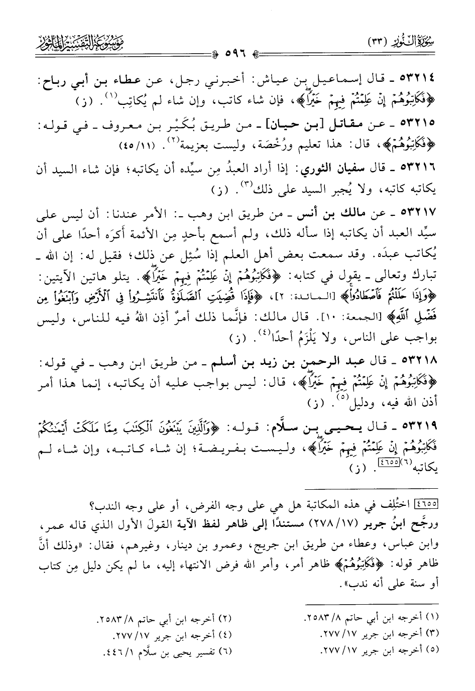 ٥٣٢١٨ - قال عبد الرحمن بن زيد بن أسلم -من طريق ابن وهب- في قوله: {فكاتبوهم إن علمتم فيهم خيرا}، قال: ليس بواجب عليه أن يكاتبه، إنما هذا أمر أذن الله فيه، ودليل (¬٥). (ز)