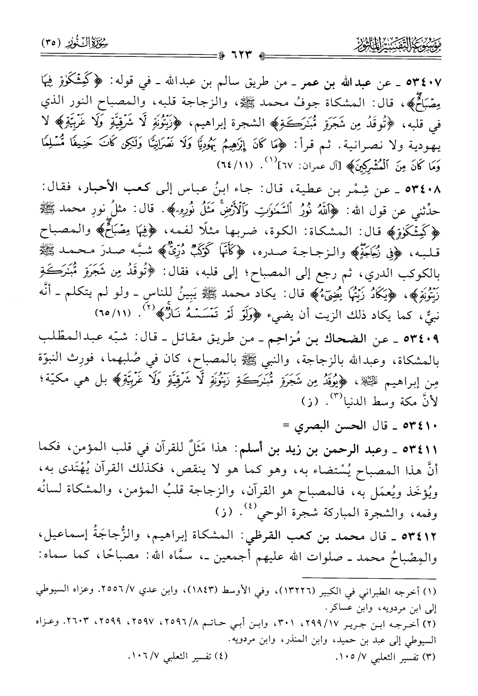 ٥٣٤٠٧ - عن عبد الله بن عمر -من طريق سالم بن عبد الله - في قوله: {كمشكاة فيها مصباح}، قال: المشكاة جوفُ محمد - صلى الله عليه وسلم -، والزجاجة قلبه، والمصباح النور الذي في قلبه، «تُوقَدُ مِن شَجَرَةٍ مُبارَكَةٍ» الشجرة إبراهيم، {زيتونة لا شرقية ولا غربية} لا يهودية ولا نصرانية. ثم قرأ: {ما كان إبراهيم يهوديا ولا نصرانيا ولكن كان حنيفا مسلما وما كان من المشركين} [آل عمران: ٦٧] (¬١). (١١/ ٦٤)