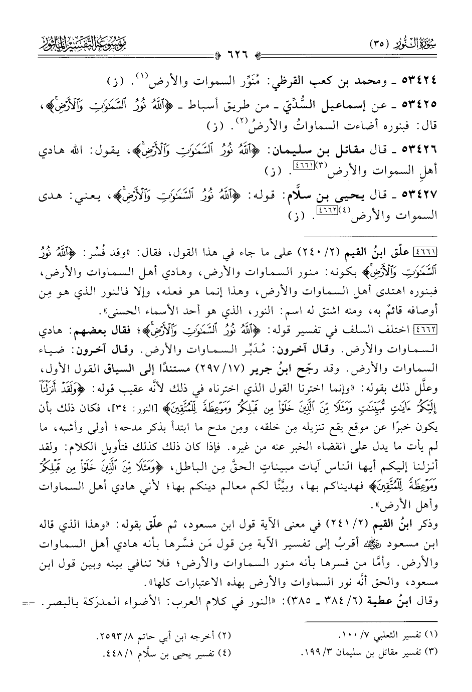 [٤٦٦١] علّق ابنُ القيم (٢/ ٢٤٠) على ما جاء في هذا القول، فقال: «وقد فُسِّر: {الله نور السماوات والأرض} بكونه: منور السماوات والأرض، وهادي أهل السماوات والأرض، فبنوره اهتدى أهل السماوات والأرض، وهذا إنما هو فعله، وإلا فالنور الذي هو مِن أوصافه قائمٌ به، ومنه اشتق له اسم: النور، الذي هو أحد الأسماء الحسنى».