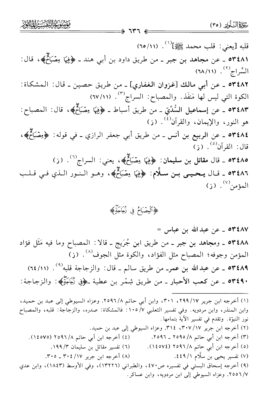 ٥٣٤٨٢ - عن أبي مالك [غزوان الغفاري]-من طريق حصين- قال: المشكاة: الكوة التي ليس لها مَنفَذ. والمصباح: السراج (¬٣). (١١/ ٦٧)