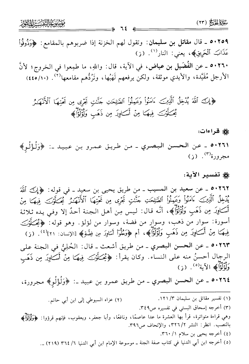 ٥٠٢٦٢ - عن سعيد بن المسيب -من طريق يحيى بن سعيد- في قوله: {إن الله يدخل الذين آمنوا وعملوا الصالحات جنات تجري من تحتها الأنهار يحلون فيها من أساور من ذهب ولؤلؤا}، أنّه قال: ليس مِن أهل الجنة أحدٌ إلا وفي يده ثلاثة أسورة: سوار من ذهب، وسوار من فضة، وسوار من لؤلؤ. وهو قوله: {يحلون فيها من أساور من ذهب ولؤلؤا}، أم {وحلوا أساور من فضة} [الإنسان: ٢١] (¬٤). (ز)