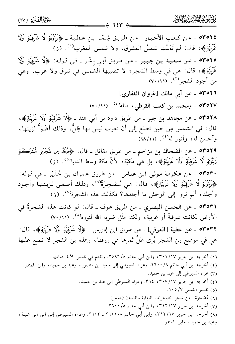 ٥٣٥٢٤ - عن كعب الأحبار -من طريق شِمْر بن عطية- {زيتونة لا شرقية ولا غربية}، قال: لم تَمَسَّها شمسُ المشرق، ولا شمس المغرب (¬١). (ز)
