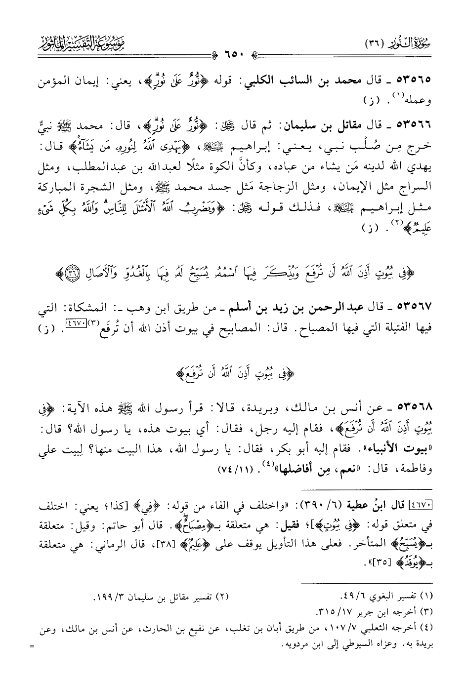 ٥٣٥٦٧ - قال عبد الرحمن بن زيد بن أسلم -من طريق ابن وهب-: المشكاة: التي فيها الفتيلة التي فيها المصباح. قال: المصابيح في بيوت أذن الله أن تُرفَع (¬٣) [٤٦٧٠]. (ز)