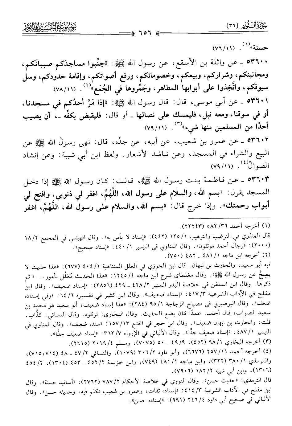 ٥٣٦٠٣ - عن فاطمة بنت رسول الله - صلى الله عليه وسلم -، قالت: كان رسول الله - صلى الله عليه وسلم - إذا دخل المسجد يقول: «بسم الله، والسلام على رسول الله، اللهم، اغفر لي ذنوبي، وافتح لي أبواب رحمتك». وإذا خرج قال: «بسم الله، والسلام على رسول الله، اللهم، اغفر