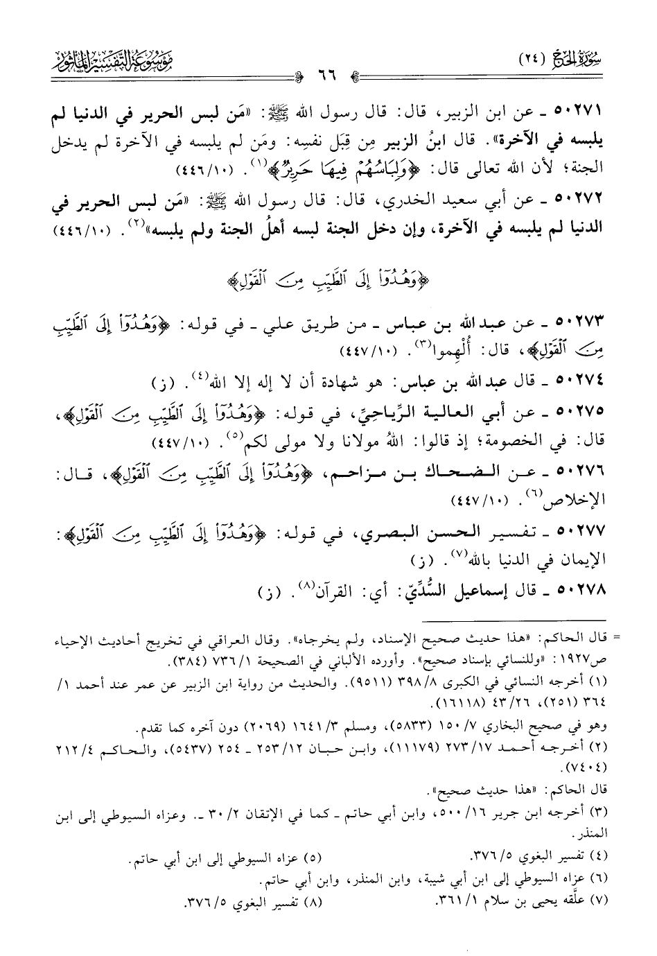 ٥٠٢٧٧ - تفسير الحسن البصري، في قوله: {وهدوا إلى الطيب من القول}: الإيمان في الدنيا بالله (¬٧). (ز)