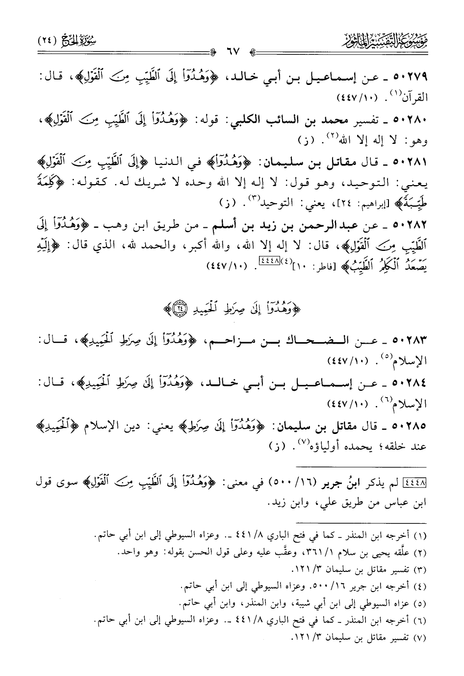 [٤٤٤٨] لم يذكر ابنُ جرير (١٦/ ٥٠٠) في معنى: {وهُدُوا إلى الطَّيِّبِ مِنَ القَوْلِ} سوى قول ابن عباس من طريق علي، وابن زيد.