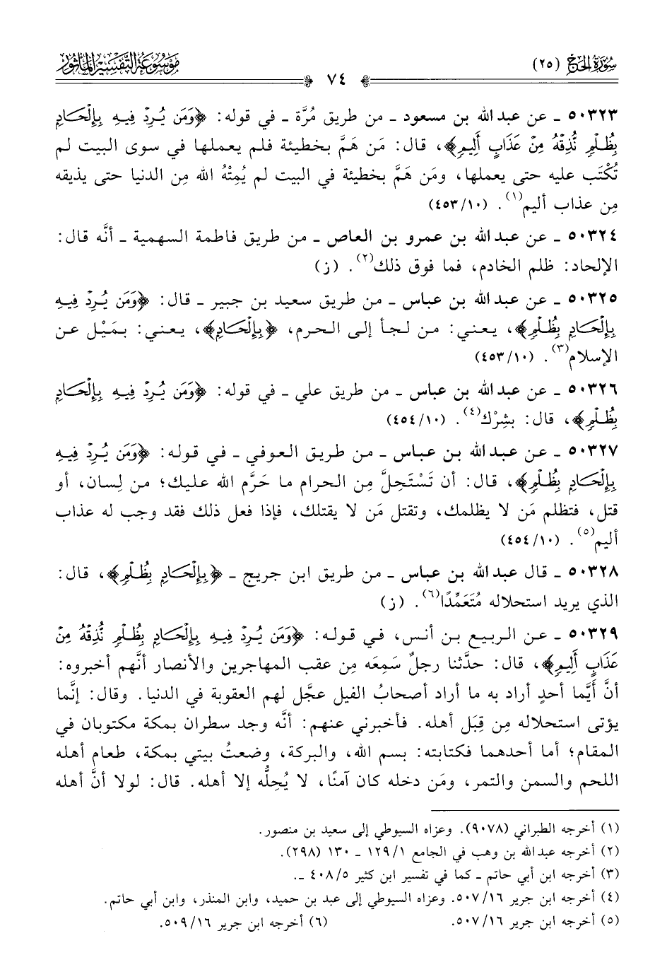 ٥٠٣٢٧ - عن عبد الله بن عباس -من طريق العوفي- في قوله: {ومن يرد فيه بإلحاد بظلم}، قال: أن تَسْتَحِلَّ مِن الحرام ما حَرَّم الله عليك؛ من لِسان، أو قتل، فتظلم مَن لا يظلمك، وتقتل مَن لا يقتلك، فإذا فعل ذلك فقد وجب له عذاب أليم (¬٥).
