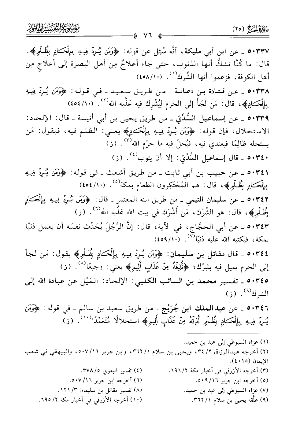 ٥٠٣٤٦ - عن عبد الملك ابن جُرَيْج -من طريق سعيد بن سالم- في قوله: {ومن يرد فيه بإلحادٍ بظلمٍ نذقه من عذاب أليم} استحلالًا مُتَعَمِّدًا (¬١٠). (ز)