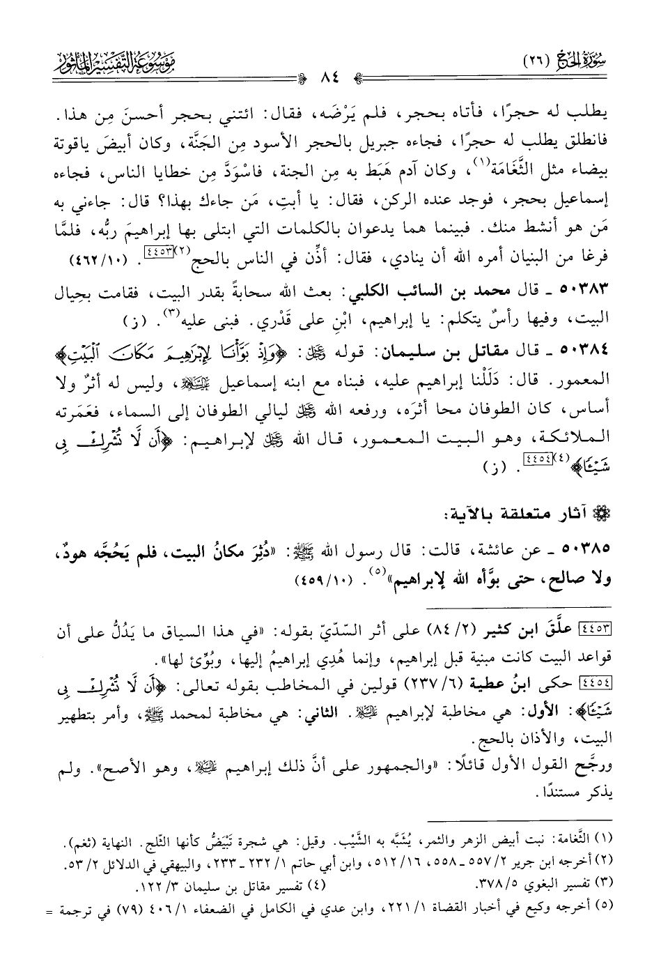 ٥٠٣٨٤ - قال مقاتل بن سليمان: قوله - عز وجل -: {وإذ بوأنا لإبراهيم مكان البيت} المعمور. قال: دَلَلْنا إبراهيم عليه، فبناه مع ابنه إسماعيل?، وليس له أثرٌ ولا أساس، كان الطوفان محا أثرَه، ورفعه الله - عز وجل - ليالي الطوفان إلى السماء، فعَمَرته الملائكة، وهو البيت المعمور، قال الله - عز وجل - لإبراهيم: {أن لا تشرك بي شيئا} (¬٤) [٤٤٥٤]. (ز)