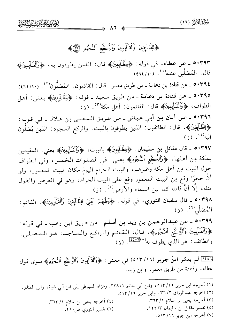 ٥٠٣٩٥ - عن قتادة بن دعامة -من طريق سعيد- قوله: {للطائفين} يعني: أهل الطواف، {والقائمين} قال: القائمون: أهل مكة (¬٣). (ز)