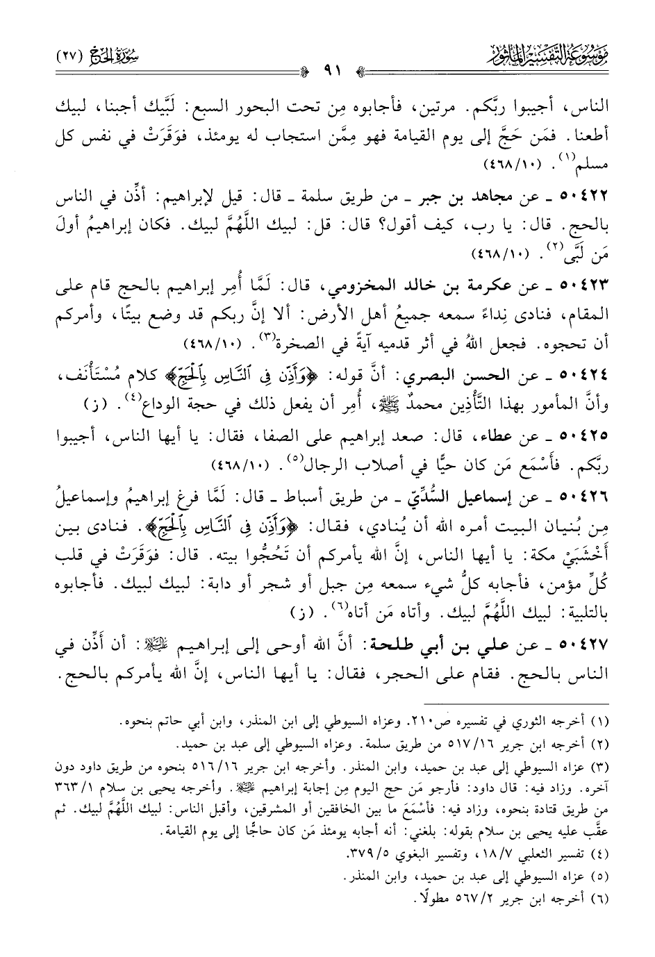 ٥٠٤٢٧ - عن علي بن أبي طلحة: أنّ الله أوحى إلى إبراهيم - عليه السلام -: أن أذِّن في الناس بالحج. فقام على الحجر، فقال: يا أيها الناس، إنّ الله يأمركم بالحج.