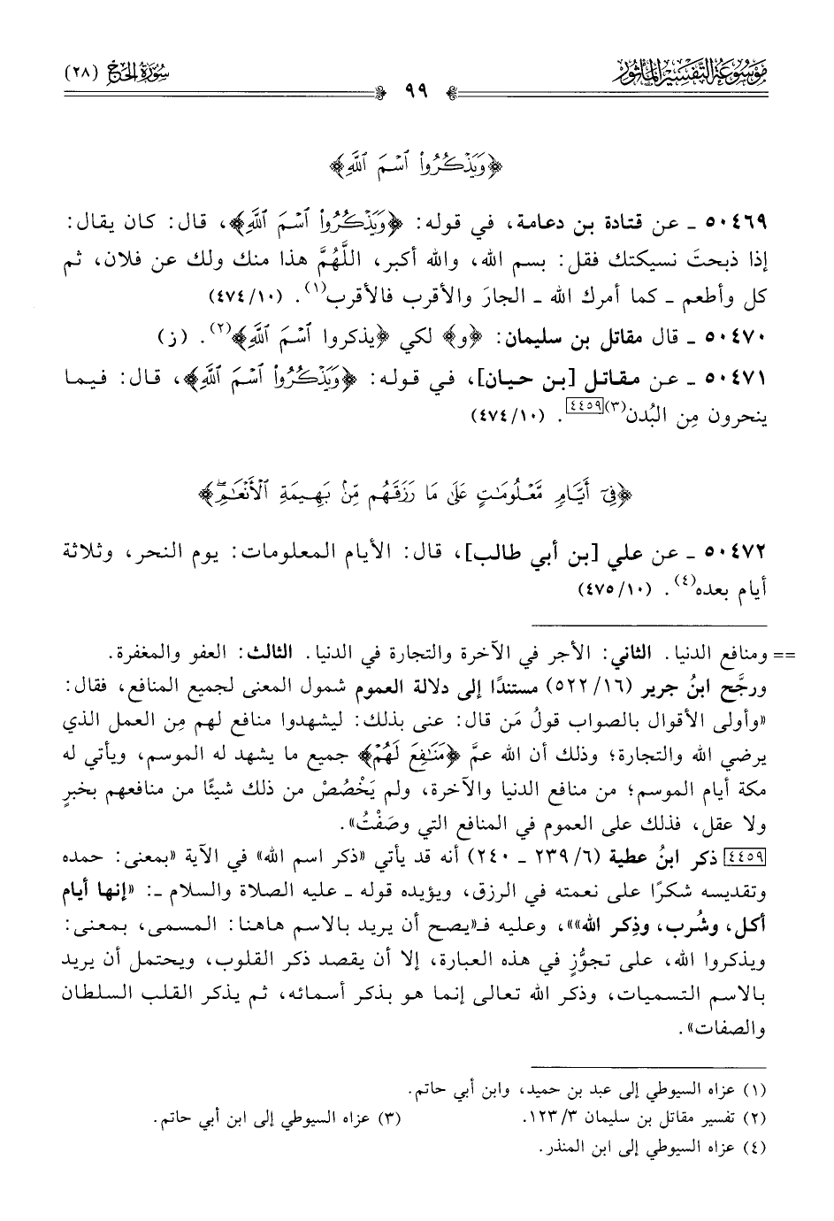 ٥٠٤٧١ - عن مقاتل [بن حيان]، في قوله: {ويذكروا اسم الله}، قال: فيما ينحرون مِن البُدن (¬٣) [٤٤٥٩]. (١٠/ ٤٧٤)