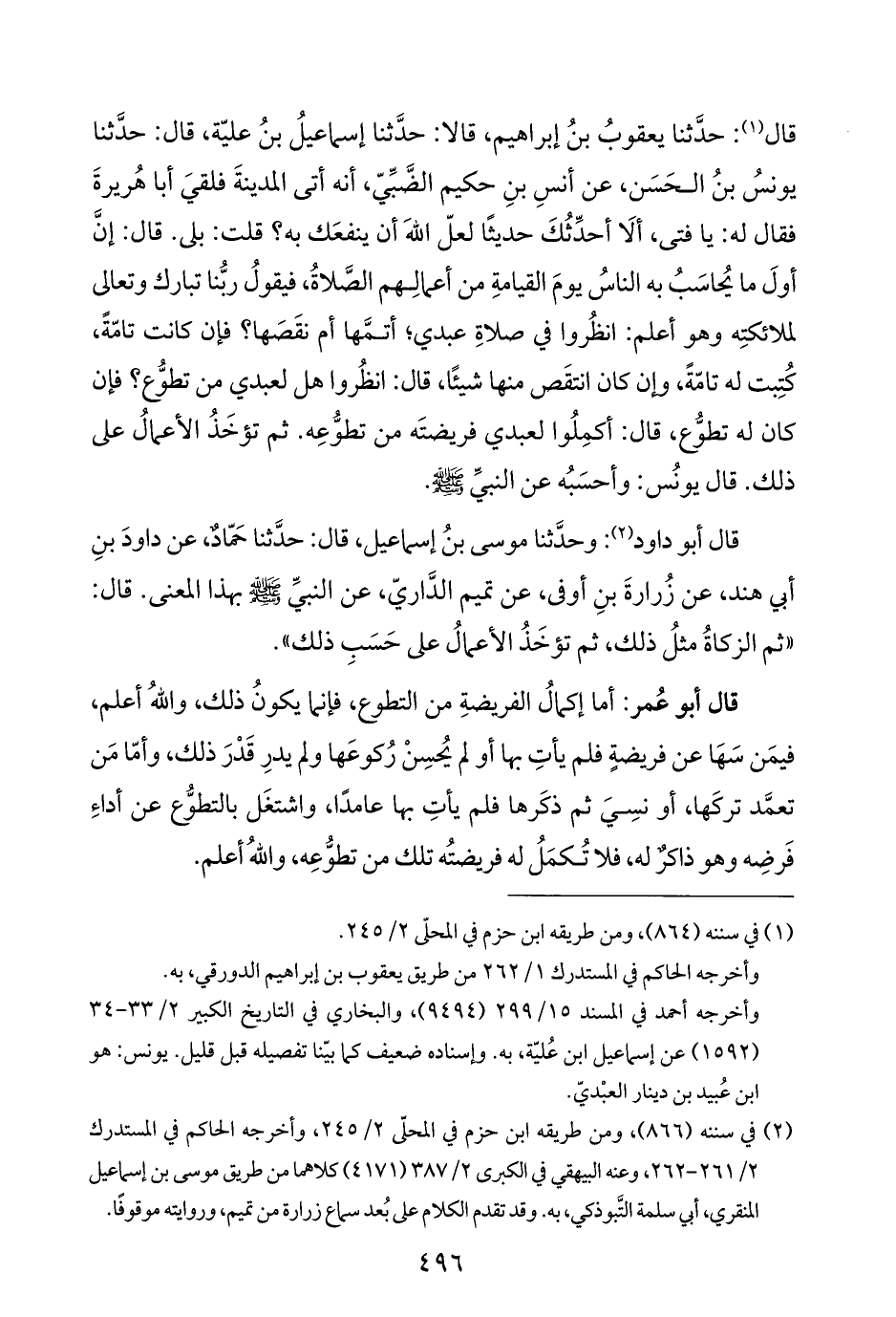 قال أبو داود (¬٢): وحدَّثنا موسى بنُ إسماعيل، قال: حدَّثنا حَمّادٌ، عن داودَ بنِ أبي هند، عن زُرارةَ بنِ أوفى، عن تميم الدَّاريّ، عن النبيِّ -صلى الله عليه وسلم- بهذا المعنى. قال: "ثم الزكاةُ مثلُ ذلك، ثم تؤخَذُ الأعمالُ على حَسَبِ ذلك".