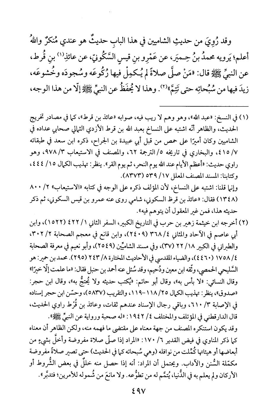 وقد رُوِيَ من حديثِ الشاميين في هذا البابِ حديثٌ هو عندي مُنكرٌ واللهُ أعلم؛ يَرويه محمدُ بنُ حِميَر، عن عَمْرِو بنِ قيسٍ السَّكُونيّ، عن عائذِ (¬١) بنِ قُرط، عن النبيِّ -صلى الله عليه وسلم- قال: "مَنْ صلَّى صلاةً لم يُكمِلْ فيها رُكُوعَه وسُجودَه وخُشوعَه، زيدَ فيها من سُبُحاتِه حتى تَتِمَّ" (¬٢). وهذا لا يُحفَظُ عن النبيِّ -صلى الله عليه وسلم- إلّا من هذا الوجه،
