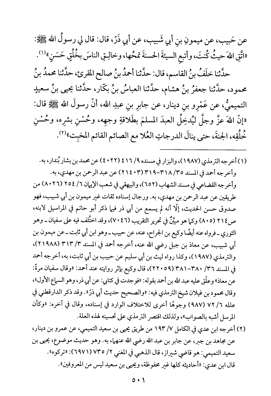 حدَّثنا خلَفُ بنُ القاسم، قال: حدَّثنا أحمدُ بنُ صالح المقرئ، حدَّثنا محمدُ بنُ محمود، حدَّثنا جعفرُ بنُ هشام، حدَّثنا العباسُ بنُ بكّار، حدَّثنا يحيى بنُ سعيدٍ التميميُّ، عن عَمْرِو بنِ دينار، عن جابرِ بنِ عبدِ الله، أنّ رسولَ الله -صلى الله عليه وسلم- قال: "إنّ اللهَ عزَّ وجلَّ ليُدخِلُ العبدَ المسلمَ بطَلاقةِ وجهِه، وحُسْنِ بشرِه، وحُسْنِ خُلُقِه، الجنةَ، حتى ينالَ الدرجاتِ العُلا مع الصائم القائم المخبِت" (¬٢).