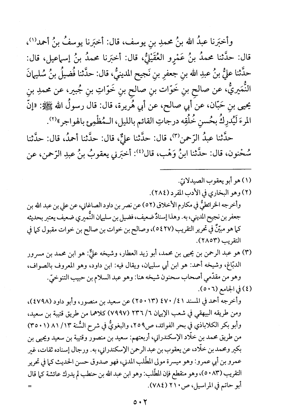وأخبَرنا عبدُ الله بنُ محمدِ بنِ يوسف، قال: أخبَرنا يوسفُ بنُ أحمد (¬١)، قال: حدَّثنا محمدُ بنُ عَمْرٍو العُقَيْليُّ، قال: أخبَرنا محمدُ بنُ إسماعيل، قال: حدَّثنا عليُّ بنُ عبدِ الله بنِ جعفرِ بنِ نَجيح المدينيُّ، قال: حدَّثنا فُضيلُ بنُ سُليمانَ النُّمَيريُّ، عن صالحِ بنِ خَوّات بنِ صالحِ بنِ خَوّاتِ بنِ جُبير، عن محمدِ بنِ يحيى بنِ حَبّان، عن أبي صالح، عن أبي هُريرة، قال: قال رسولُ الله -صلى الله عليه وسلم-: "إنّ المرءَ لَيُدرِكُ بحُسنِ خُلُقِه درجاتِ القائم بالليل، المُظْمِئ بالهواجر" (¬٢).