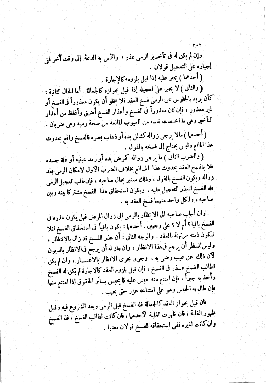 (والضرب الثاني) ما يرجى زواله كمرض يده أو رمد عينيه أو علة جسده فلا ينفسخ العقد بحدوث هذا المانع بخلاف الضرب الاول لامكان الرمى بعد زواله ويكون الفسخ بالقول، وذلك معتبر بحال صاحبه، فإن طلب تعجيل الرمى فله الفسخ لتعذر التعجيل عليه، ويكون استحقاق هذا الفسخ مشتركا بينه وبين صاحبه، ولكل واحد منهما فسخ العقد به.