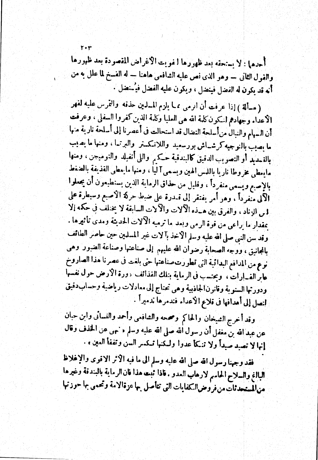 (مسألة) إذا عرفت أن الرمى مما يلزم المسلمين حذقه والتمرس عليه لقهر الاعداء وجهادهم لتكون كلمة الله هي العليا وكلمة الذين كفروا السفلى، وعرفت أن السهام والنبال من أسلحة النضال قد استحالت في أعصرنا إلى أسلحة نارية منها ما يصيب بالتوجيه كرشاش بور سعيد واللانكستر والبرتا، ومنها ما يصيب بالتسديد أو التصويب الدقيق كالبندقية حكيم واللى أنفيلد والتوميجن، ومنها ما يعطى مخروطا ناريا باللمس الهين ويسمى آليا، ومنها ما يعطى القذيفة بالضغط بالاصبع ويسمى منفردا، وقليل من حذاق الرماية الذين يستطيعون أن يجعلوا الآلي منفردا، وهو أمر يفتقر إلى قدرة على ضبط حركة الاصبع وسيطرة على لمس الزناد، والفرق بين هذه الآلات والآلات السابقة لا يختلف في حكمه إلا بمقدار ما يراعى من قوة الرمى وبعد ما ترميه الآلات الحديثة ومدى تأثيرها.