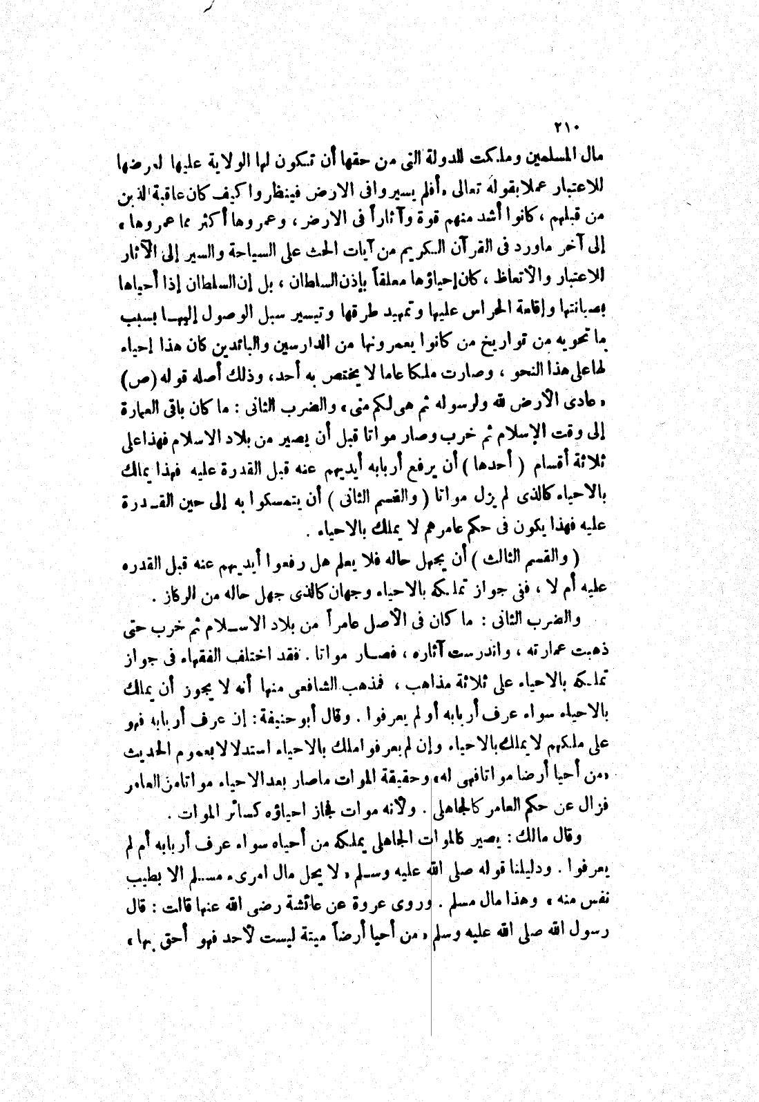 مال المسلمين وملكت الدولة التى من حقها أن تكون لها الولاية عليها لعرضها للاعتبار عملا بقوله تعالى (أفلم يسيروا في الارض فينظروا كيف كان عاقبة الذين من قبلهم، كانوا أشد منهم قوة وآثارا في الارض، وعمروها أكثر مما عمروها) إلى آخر ما ورد في القرآن الكريم من آيات الحث على السياحة والسير إلى الآثار للاعتبار والاتعاظ، كان إحياؤها معلقا بإذن السلطان، بل إن السلطان إذا أحياها بصيانتها وإقامة الحراس عليها وتمهيد طرقها وتيسير سبل الوصول إليها بسبب ما تحويه من تواريخ من كانوا يعمرونها من الدارسين والبائدين كان هذا إحياء لها على هذا النحو، وصارت ملكا عاما لا يختص به أحد، وذلك أصله قوله صلى الله عليه وسلم (عادى الارض لله ولرسوله ثم هي لكم منى) والضرب الثاني: ما كان باقى العمارة إلى وقت الاسلام ثم خرب وصار مواتا قبل أن يصير من بلاد الاسلام فهذا على ثلاثة أقسام
