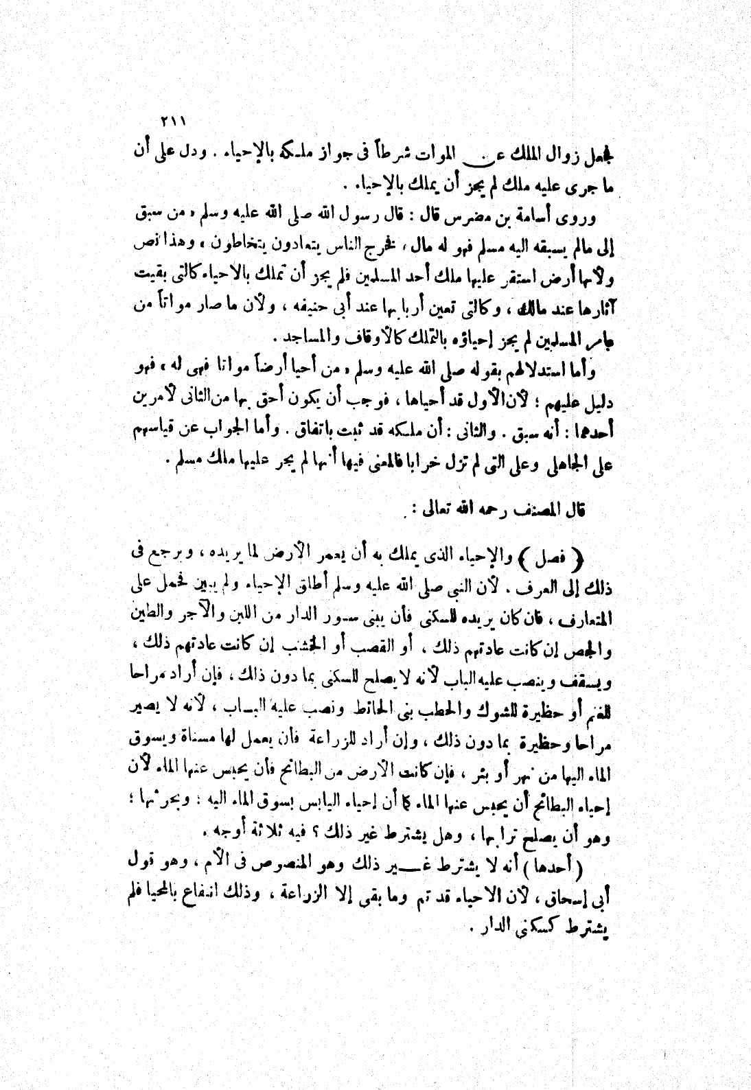 وروى أسامة بن مضرس قَالَ: قَالَ رَسُولُ اللَّهِ صَلَّى اللَّهُ عَلَيْهِ وسلم (من سبق إلى ما لم يسبق إليه مسلم فهو له مال، فخرج الناس يتعادون يتخاطون) وهذا نص ولانها أرض استقر عليها ملك أحد المسلمين فلم يجز أن تملك بالاحياء كالتى بقيت آثارها عند مالك، وكالتى تعين أربابها عند إبى حنيفة، ولان ما صار مواتا من عامر المسلمين لم يجز إحياؤه بالتملك كالاوقاف والمساجد.
