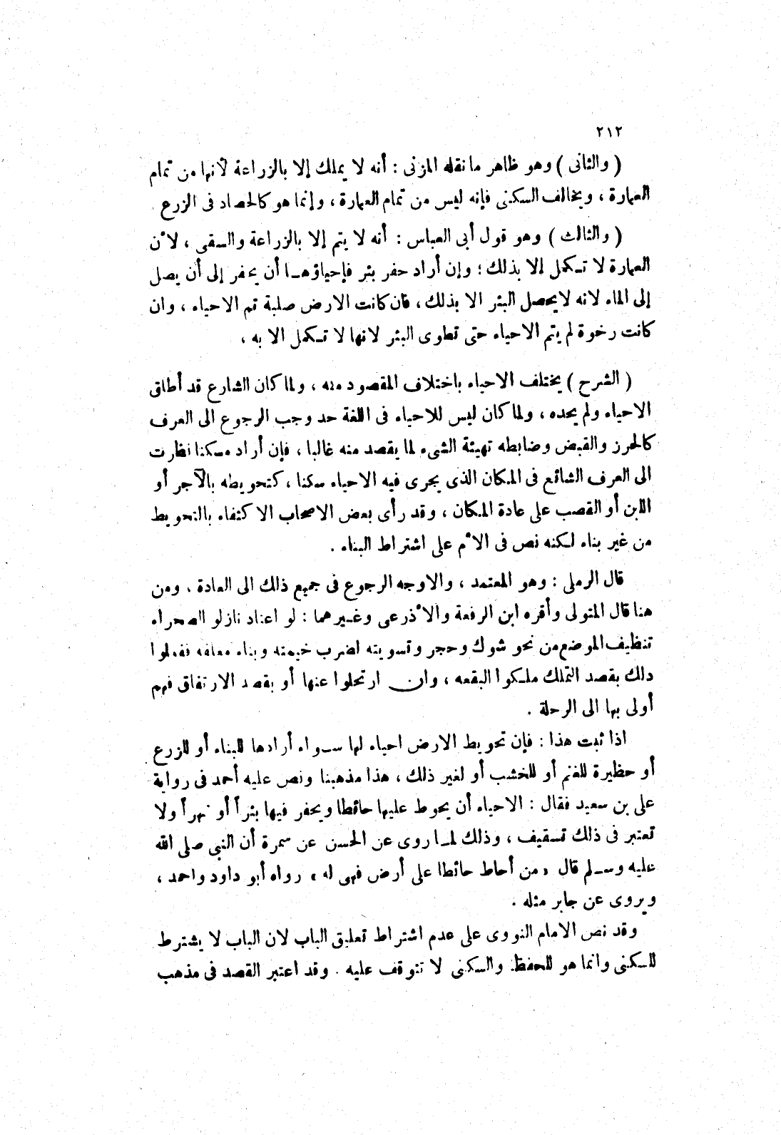 العمارة لا تكمل إلا بذلك، وإن أراد حفر بئر فإحياؤها أن يحفر إلى أن يصل إلى الماء لانه لا يحصل البئر الا بذلك، فان كانت الارض صلبة تم الاحياء، وان كانت رخوة لم يتم الاحياء حتى تطوى البئر لانها لا تكمل الا به، (الشرح) يختلف الاحياء باختلاف المقصود منه، ولما كان الشارع قد أطلق الاحياء لم يحده، ولما كان ليس للاحياء في اللغة حد وجب الرجوع إلى العرف كالحرز والقبض وضابطه تهيئة الشئ لما يقصد منه غالبا، فإن أراد مسكنا نظرت إلى العرف الشائع في المكان الذى يجرى فيه الاحياء سكنا، كتحويطه بالآجر أو اللبن أو القصب على عادة المكان، وقد رأى بعض الاصحاب الاكتفاء بالتحويط من غير بناء لكنه نص في الام على اشتراط البناء.