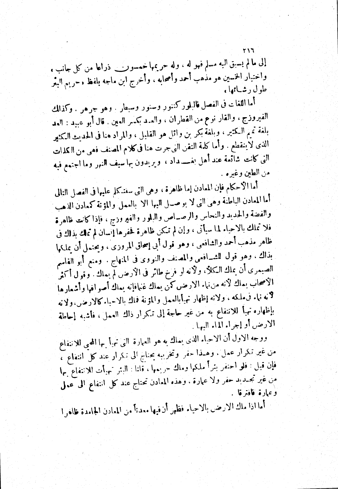 إلى ما لم يسبق إليه مسلم فهو له، وله حريمها خمسون ذراعا من كل جانب) واختيار الخمسين هو مذهب أحمد وأصحابه، وأخرج ابن ماجه بلفظ (حريم البئر طول رشائها) أما اللغات في الفصل فالبلور كنتور وسنور وسبطر.