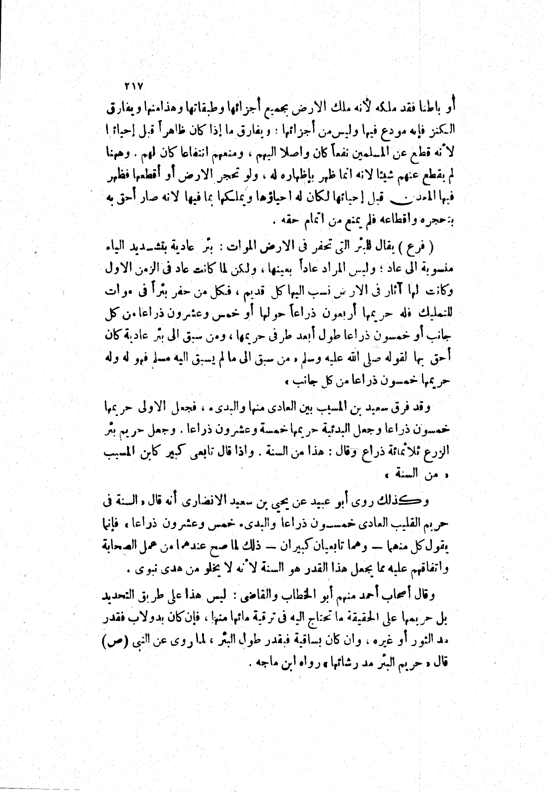 وجعل حريم بئر الزرع ثلاثمائة ذراع وقال: هذا من السنة.