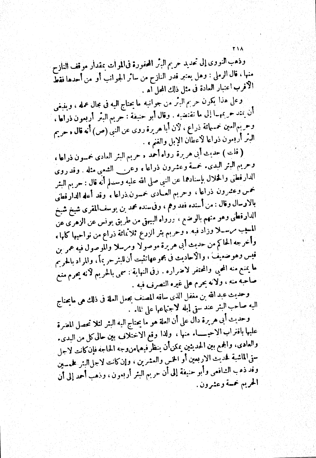 وقد روى الدارقطني والخلال بإسنادهما عَنْ النَّبِيِّ صَلَّى اللَّهُ عَلَيْهِ وَسَلَّمَ أَنَّهُ قال: حريم البئر خمس وعشرون ذراعا، وحريم العادى خمسون ذراعا) وقد أعله الدارقطني بالارسال وقال: من أسنده فقد وهم، وفى سنده محمد بن يوسف المقرى شيخ شيخ الدارقطني وهو منهم بالوضع، ورواه البيهقى من طريق يونس عن الزهري عن المسيب مرسلا وزاد فيه (وحريم بئر الزرع ثلاثمائة ذراع من نواحيها كلها) وأخرجه الحاكم من حديث أبى هريرة موصولا ومرسلا والموصول فيه عمر بن قيس وهو ضعيف: والاحاديث في مجموعها تثبت أن للبئر حريما، والمراد بالحريم ما يمنع منه المحيى والمحتفر لاضراره.