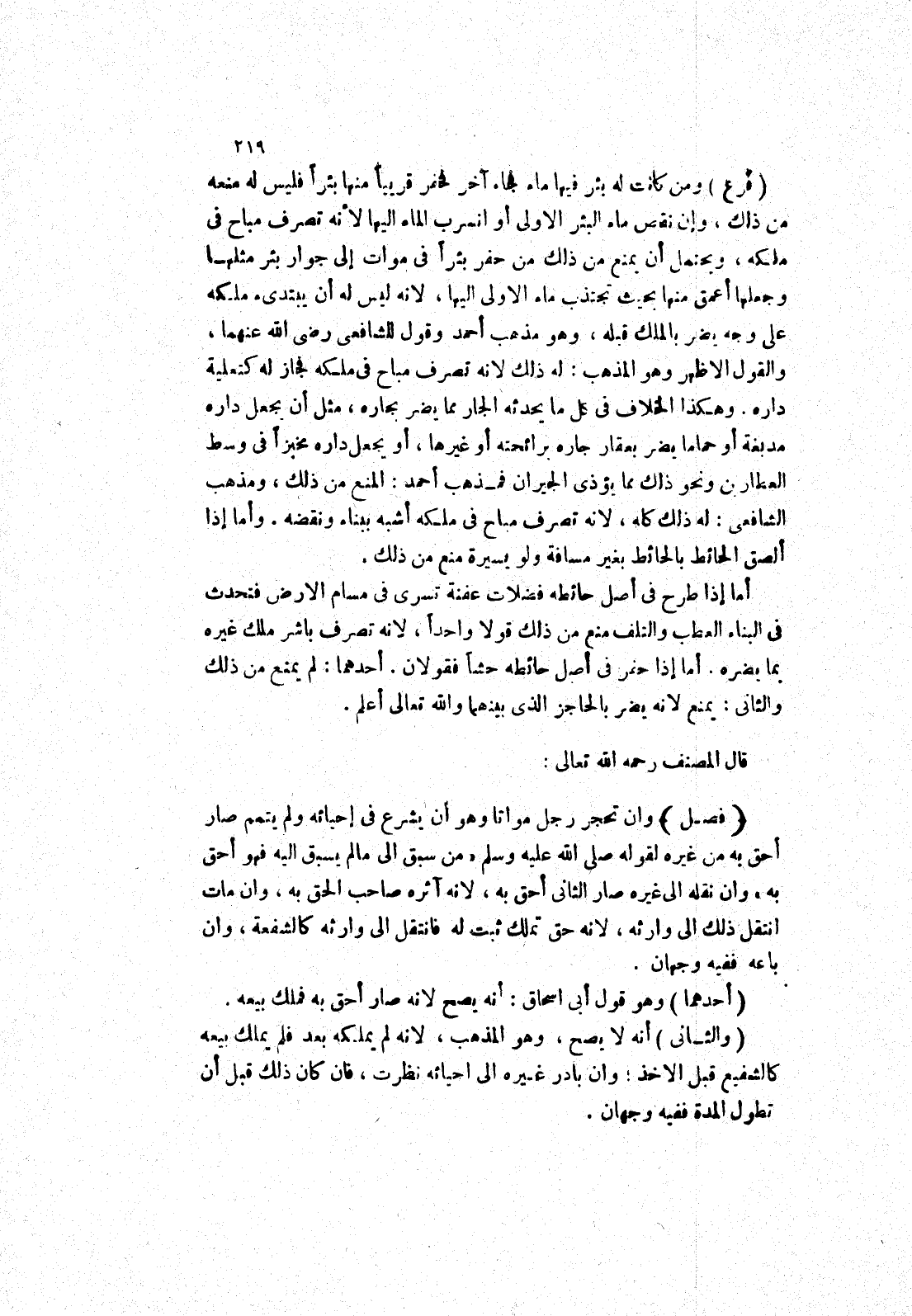 ومن كانت له بئر فيها ماء فجاء آخر فحفر قريبا منها بئرا فليس له منعه من ذلك، وإن نقص ماء البئر الاولى أو انسرب الماء إليها لانه تصرف مباح في ملكه، ويحتمل أن يمنع من ذلك من حفر بئرا في موات إلى جوار بئر مثلها وجعلها أعمق منها بحيث تجتذب ماء الاولى إليها، لانه ليس له أن يبتدئ ملكه على وجه يضر بالملك قبله، وهو مذهب أحمد وقول للشافعي رضى الله عنهما، والقول الاظهر وهو المذهب: له ذلك لانه تصرف مباح في ملكه فجاز له كتعلية داره.