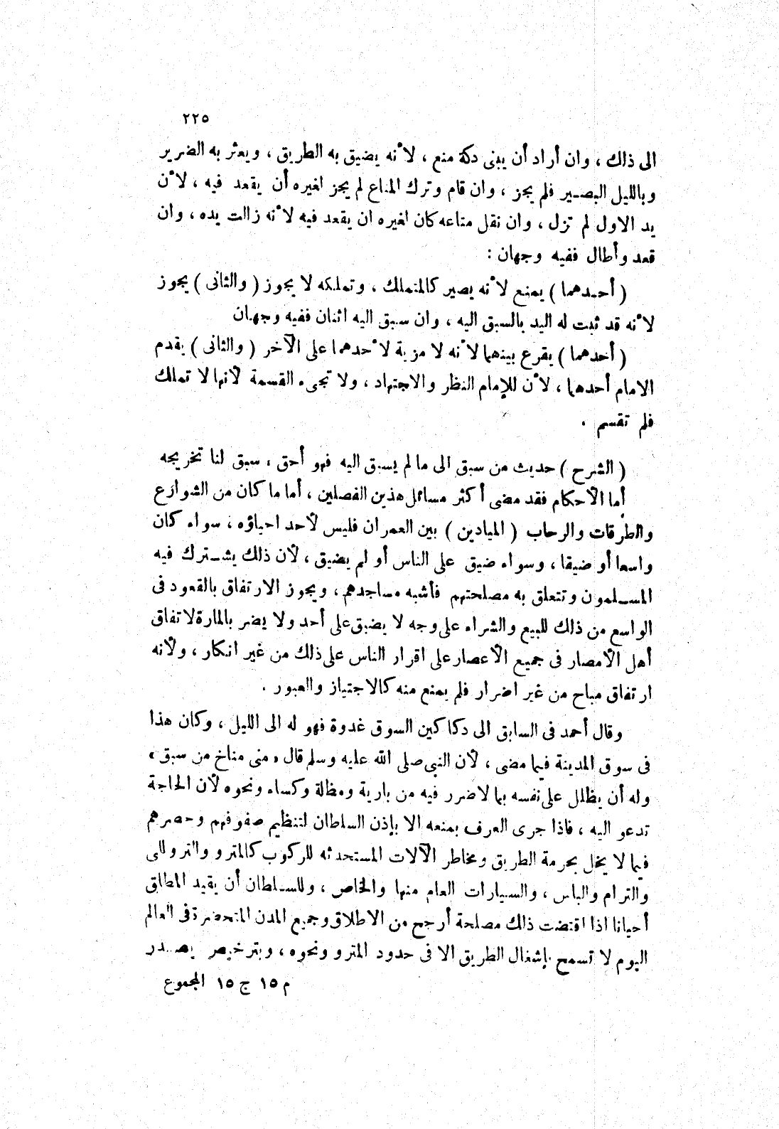 وقال أحمد في السابق إلى دكاكين السوق غدوة فهو له إلى الليل، وكان هذا في سوق المدينة فيما مضى، لِأَنَّ النَّبِيَّ صَلَّى اللَّهُ عَلَيْهِ وَسَلَّمَ قَالَ (منى مناخ من سبق) وله أن يظلل على نفسه بما لا ضرر فيه من بارية ومظلة وكساء ونحوه لان الحاجة تدعو إليه، فإذا جرى العرف بمنعه الا بإذن السلطان لتنظيم صفوفهم وحصرهم فيما لا يخل بحرمة الطريق ومخاطر الآلات المستحدثه للركوب كالمترو والتروللى والترام والباس، والسيارات العام منها والخاص، وللسلطان أن يقيد المطلق أحيانا إذا اقتضت ذلك مصلحة أرجح من الاطلاق وجميع المدن المتحضرة في العالم اليوم لا تسمح بإشغال الطريق الا في حدود المترو ونحوه، وبترخيص يصدر