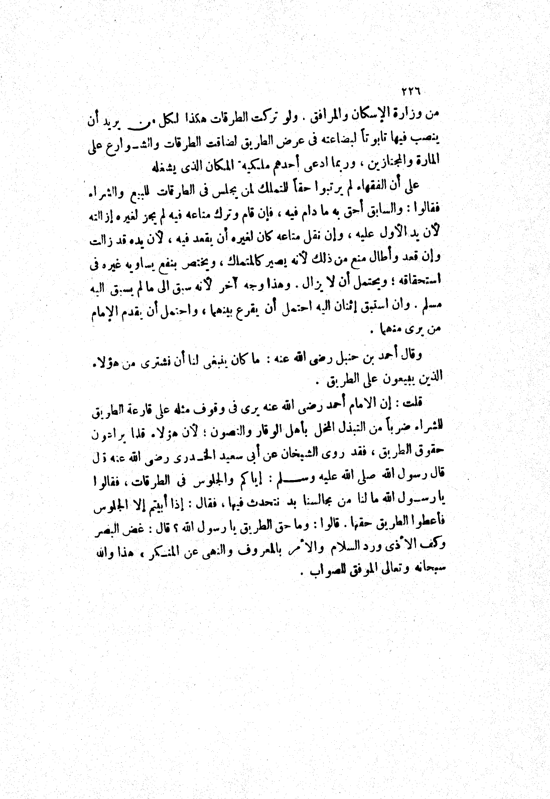 قلت: إن الامام أحمد رضى الله عنه يرى في وقوف مثله على قارعة الطريق للشراء ضربا من التبذل المخل بأهل الوقار والنصون: لان هؤلاء قلما يراعون حقوق الطريق، فقد روى الشيخان عَنْ أَبِي سَعِيدِ الْخُدْرِيِّ رَضِيَ اللَّهُ عَنْهُ قَالَ قال رسول الله عليه وسلم: إياكم والجلوس في الطرقات، فقالوا يا رسول الله مالنا من مجالسنا بد نتحدث فيها، فقال: إذا أبيتم إلا الجلوس فأعطوا الطريق حقها.