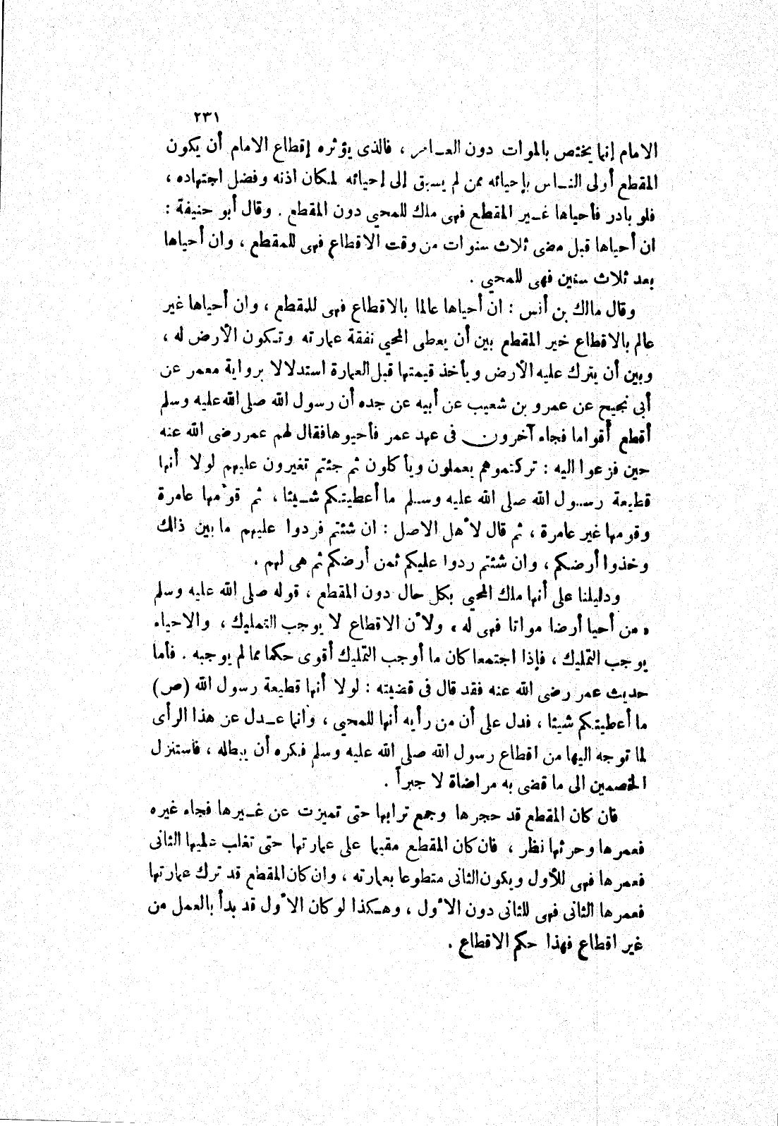 فأما حديث عمر رضى الله عنه فقد قال في قضيته: لولا أنها قطيعة رَسُولَ اللَّهِ صَلَّى اللَّهُ عَلَيْهِ وَسَلَّمَ مَا أعطيتكم شيئا، فدل على أن من رأيه أنها للمحيى، وانما عدل عن هذا الرأى لما توجه إليها من اقطاع رسول الله صلى الله عليه وسلم فكره أن يبطله، فاستنزل الخصمين إلى ما قضى به مراضاة لا جبرا.