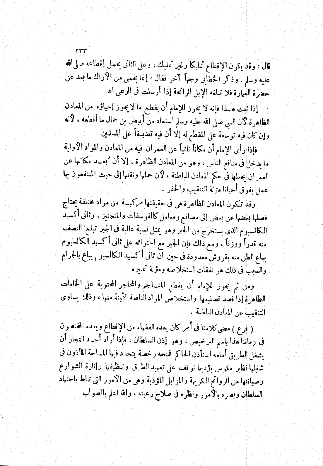 منه قدرا ووزنا، ومع ذلك فإن الجير مع احتوائه على ثانى أكسيد الكالسيوم يباع الطن منه بقروش معدودة في حين ان ثانى أكسيد الكالسيوم يباع بالجرام والسببت في ذلك هو نفقات استخلاصه ومؤنة تميزه ومن ثم يجوز للامام أن يقطع المناجم والمحاجر المحتوية على الخامات الظاهرة إذا قصد تصنيعها واستخلاص المواد النافعة الثمينة منها، وذلك يساوى التنقيب عن المعادن الباطنة.