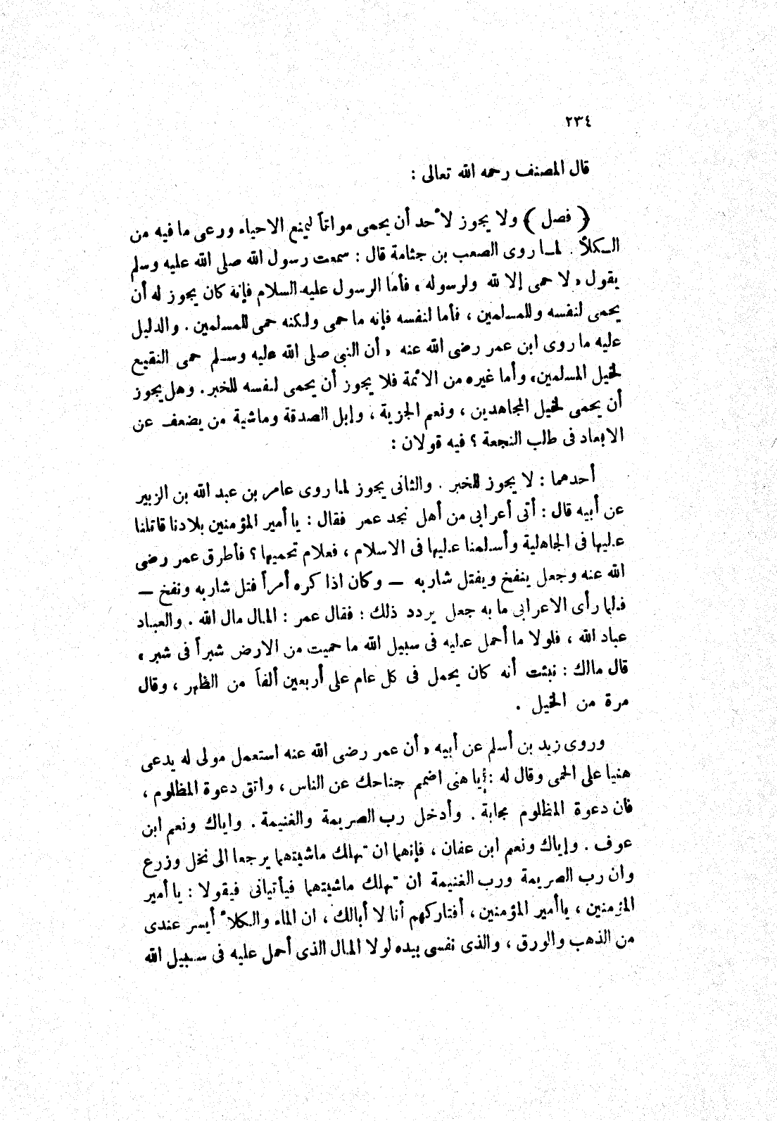 والثانى يجوز لما روى عامر بن عبد الله بن الزبير عن أبيه قال: أتى أعرابي من أهل نجد عمر فقال: يا أمير المؤمنين بلادنا قاتلنا عليها في الجاهلية وأسلمنا عليها في الاسلام، فعلام تحميها؟ فأطرق عمر رضى الله عنه وجعل ينفخ ويفتل شاربه وكان إذا كره أمرا فتل شاربه ونفخ فلما رأى الاعرابي ما به جعل يردد ذلك: فقال عمر: المال مال الله.