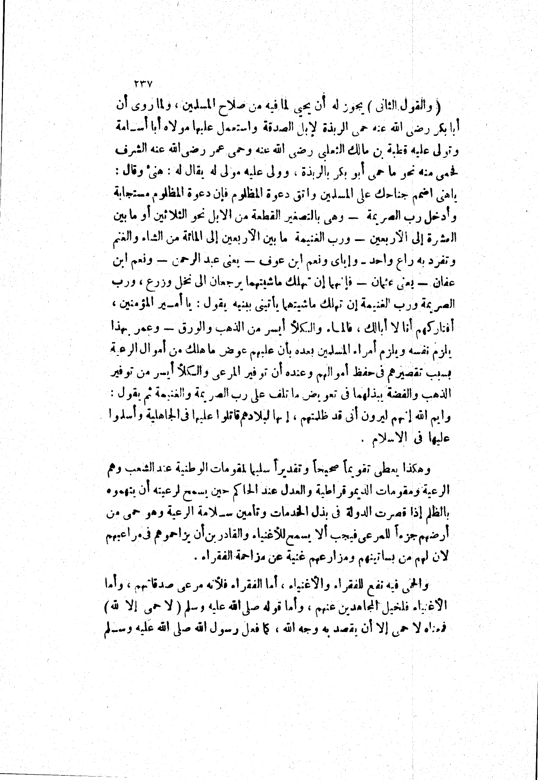 (والقول الثاني) يجوز له أن يحيى لما فيه من صلاح المسلمين، ولما روى أن أبا بكر رضى عنه حميى الربذة لابل الصدقة واستعمل عليها مولاه أبا أسامة وتولى عليه قطبة بن مالك الثعلبي رضى الله عنه وحمى عمر رضى الله عنه الشرف فحمى منه نحو ما حمى أبو بكر بالربذة، وولى عليه مولى له يقال له: هنئ وقال: يا هنى اضمم جناحك على المسلمين واتق دعوة المظلوم فإن دعوه المظلوم مستجابة وأدخل رب الصريمة وهى بالتصغير القطعة من الابل نحو الثلاثين أو ما بين العشرة إلى الاربعين ورب الغنيمة ما بين الاربعين إلى المائة من الشاء والغنم وتفرد به راع واحد وإياى ونعم ابن عوف يعنى عبد الرحمن ونعم ابن عفان يعنى عثمان فإنهما إن تهلك ماشيتهما يرجعان إلى نخل وزرع، ورب الصريمة ورب الغنيمة إن تهلك ماشيتهما يأتيني ببنيه يقول: يا أمير المؤمنين، أفتاركهم أنا لا أبالك، فالماء والكلا أيسر من الذهب والورق وعمر بهذا يلزم نفسه ويلزم أمراء المسلمين بعده بأن عليهم عوض ما هلك من أموال الرعية بسبب تقصيرهم في حفظ أموالهم وعنده أن توفير المرعى والكلا أيسر من توفير الذهب والفضة يبذلهما في تعويض ما تلف على رب الصريمة والغنيمة ثم يقول: وايم الله إنهم ليرون أنى قد ظلمتهم، إنها لبلادهم قاتلوا عليها في الجاهلية وأسلموا عليها في الاسلام.