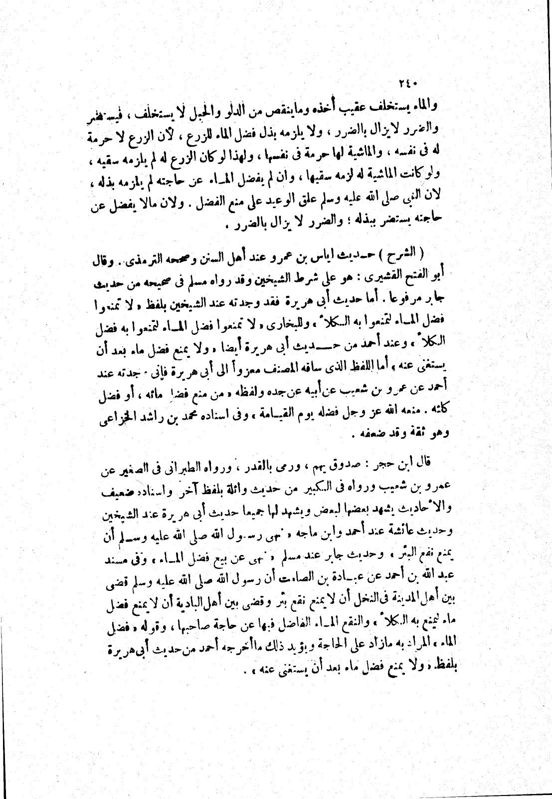 قال ابن حجر: صدوق يهم، ورمى بالقدر، ورواه الطبراني في الصغير عن عمرو بن شعيب ورواه في الكبير من حديث وائلة بلفظ آخر واسناده ضعيف والاحاديث يشهد بعضها لبعض ويشهد لها جميعا حديث أبى هريرة عند الشيخين وحديث عائشة عند أحمد وابن ماجه (نَهَى رَسُولُ اللَّهِ صَلَّى اللَّهُ عَلَيْهِ وَسَلَّمَ إنَّ يمنع نفع البئر) وحديث جابر عند مسلم (نهى عن بيع فضل الماء) وفى مسند عبد الله بن أحمد عن عُبَادَةَ بْنِ الصَّامِتِ أَنَّ رَسُولَ اللَّهِ صَلَّى اللَّهُ عَلَيْهِ وَسَلَّمَ قضى بين أهل المدينة في النخل أن لا يمنع نقع بئر وقضى بين أهل البادية أن لا يمنع فضل ماء ليمنع به الكلا) والنقع الماء الفاضل فيها عن حاجة صاحبها، وقوله (فضل الماء) المراد به ما زاد على الحاجة ويؤيد ذلك ما أخرجه أحمد من حديث أبى هريرة بلفظ (ولا يمنع ماء بعد أن يستغنى عنه) .