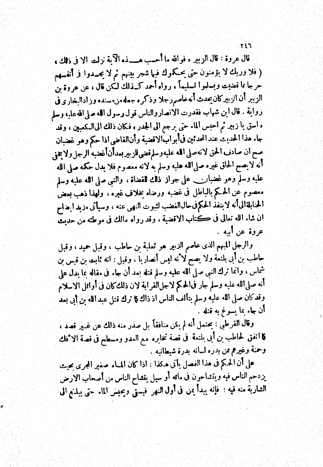 قال عروة: قال الزبير (فوالله ما أحسب هذه الآية نزلت الا في ذلك) فلا وربك لا يؤمنون حتى يحكموك فيما شجر بينهم ثم لا يجدوا في أنفسهم حرجا مما قضيت ويسلموا تسليما) رواه أحمد كذلك لكن قال، عن عروة بن الزبير أن الزبير كان يحدث أنه خاصم رجلا وذكره جعله من مسنده وزاد البخاري في رواية.