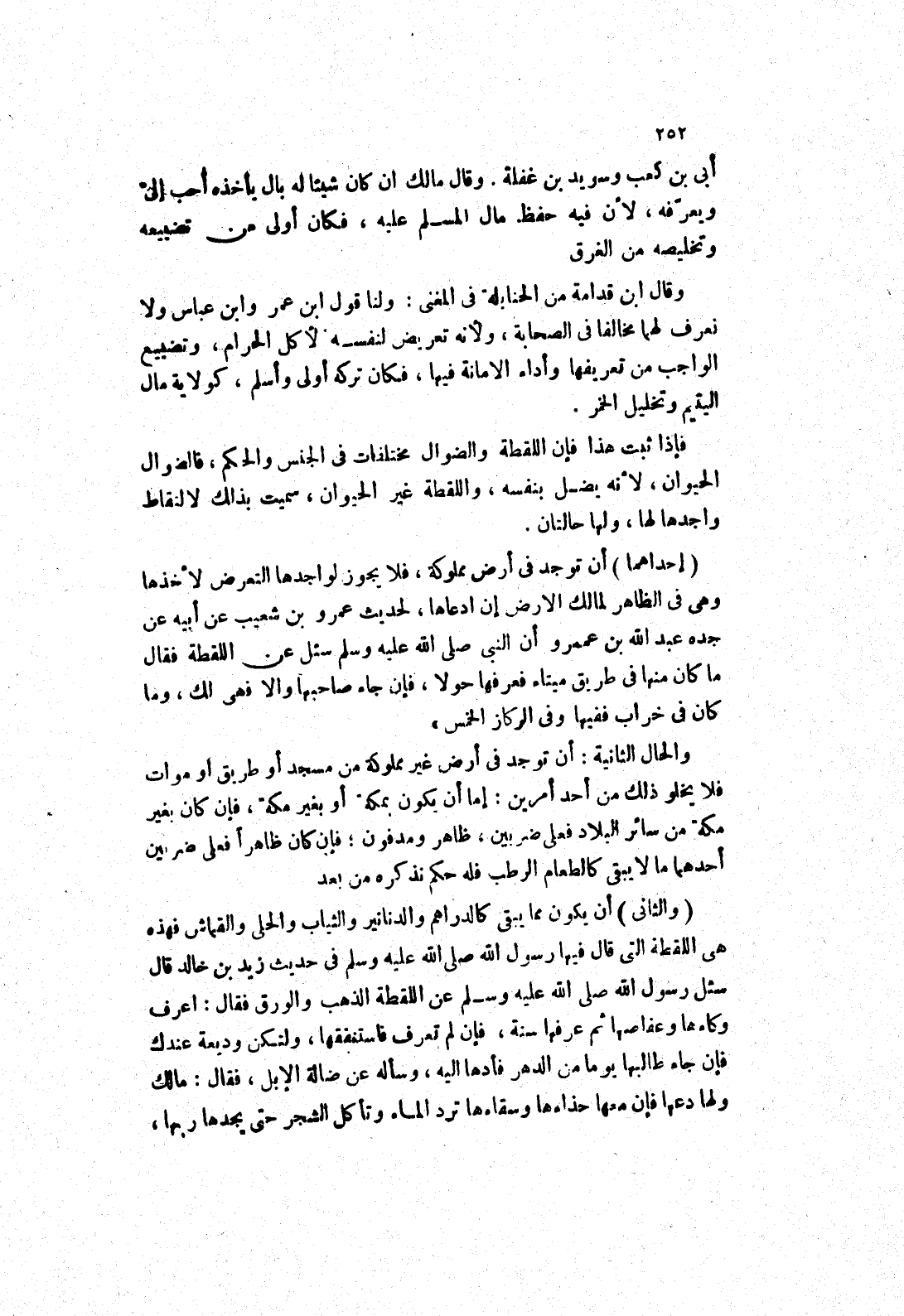 أن يكون مما يبقى كالدراهم والدنانير والثياب والحلى والقماش فهذه هي اللقطة التى قال فِيهَا رَسُولِ اللَّهِ صَلَّى اللَّهُ عَلَيْهِ وَسَلَّمَ فِي حديث زيد بن خالد قَالَ سُئِلَ رَسُولُ اللَّهِ صَلَّى اللَّهُ عَلَيْهِ وَسَلَّمَ عَنْ اللقطة الذهب والورق فقال: اعرف وكاءها وعفاصها ثم عرفها سنة، فإن لم تعرف فاستنفقها، ولتكن وديعة عندك فإن جاء طالبها يوما من الدهر فأدها إليه، وسأله عن ضالة الابل، فقال: مالك ولها دعها فإن معها حذاءها وسقاءها ترد الماء وتأكل الشجر حتى يجدها ربها،