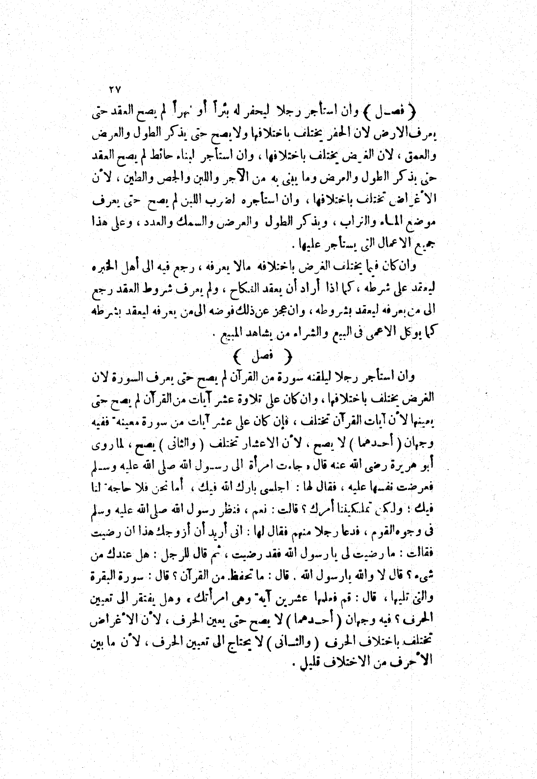 وان استأجر رجلا ليحفر له بئرا أو نهرا لم يصح العقد حتى يعرف الارض لان الحفر يختلف باختلافها ولا يصح حتى يذكر الطول والعرض والعمق، لان الغرض يختلف باختلافها، وان استأجر لبناء حائط لم يصح العقد حتى يذكر الطول والعرض وما يبنى به من الآجر واللبن والجص والطين، لان الاغراض تختلف باختلافها، وان استأجره لضرب اللبن لم يصح حتى يعرف