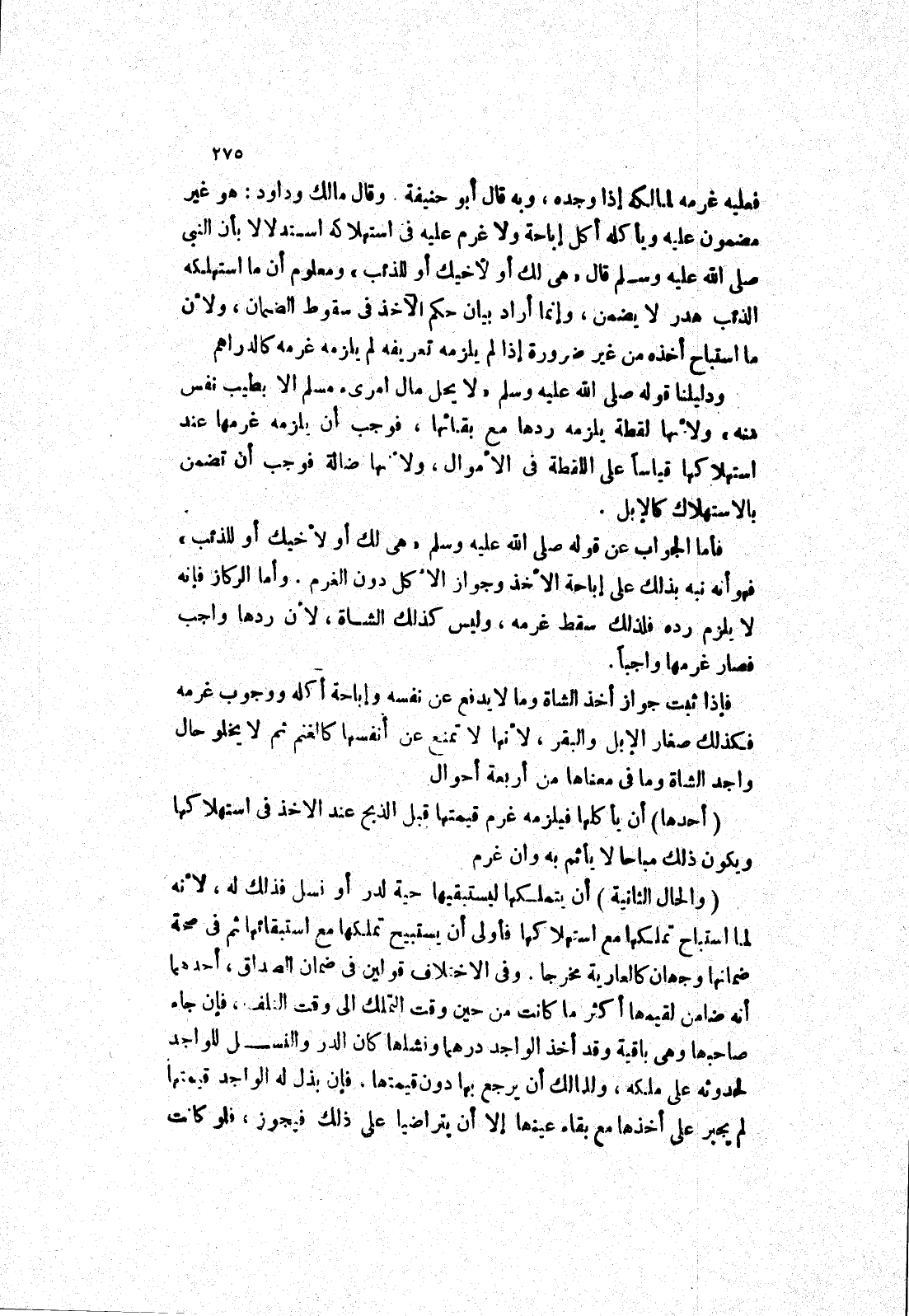فإذا ثبت جواز أخذ الشاة وما لا يدلع عن نفسه وإباحة أكله ووجوب غرمه فكذلك صغار الابل والبقر، لانها لا تمنع عن أنفسها كالغنم ثم لا يخلو حال واجد الشاة وما في معناها من أربعة أحوال (أحدها) أن يأكلها فيلزمه غرم قيمتها قبل الذبح عند الاخذ في استهلاكها ويكون ذلك مباحا لا يأثم به وان غرم (والحال الثانية) أن يتملكها ليستبقيها حية لدر أو نسل فذلك له، لانه لما استباح تملكها مع استهلاكها فأولى أن يستبيح تملكها مع استبقائها ثم في صحة ضمانها وجهان كالعارية مخرجا.