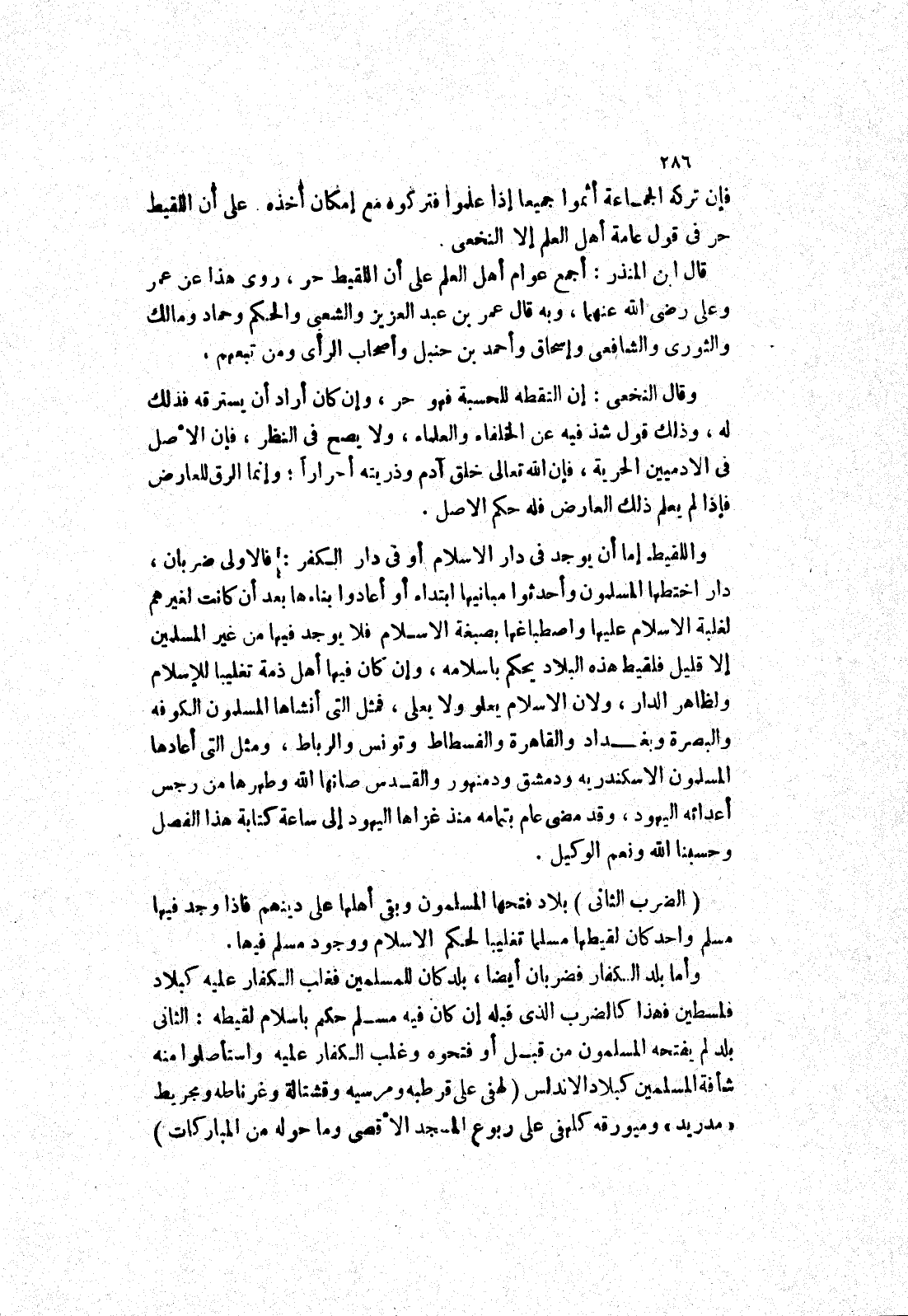 وأما بلد الكفار فضربان ايضا، بلد كان للمسلمين فغلب الكفار عليه كبلاد فلسطين فهذا كالضرب الذى قبله ان كان فيه مسلم حكم باسلام لقيطه: الثاني بلد لم يفتحه المسلمون من قبل أو فتحوه وغلب الكفار عليه واستأصلوا منه شأفة المسلمين كبلاد الاندلس (لهفى على قرطبه ومرسية وقشتالة وغرناطة ومجريط (مدريد) وميورقه كلهفي على ربوع المسجد الاقصى وما حوله من المباركات)