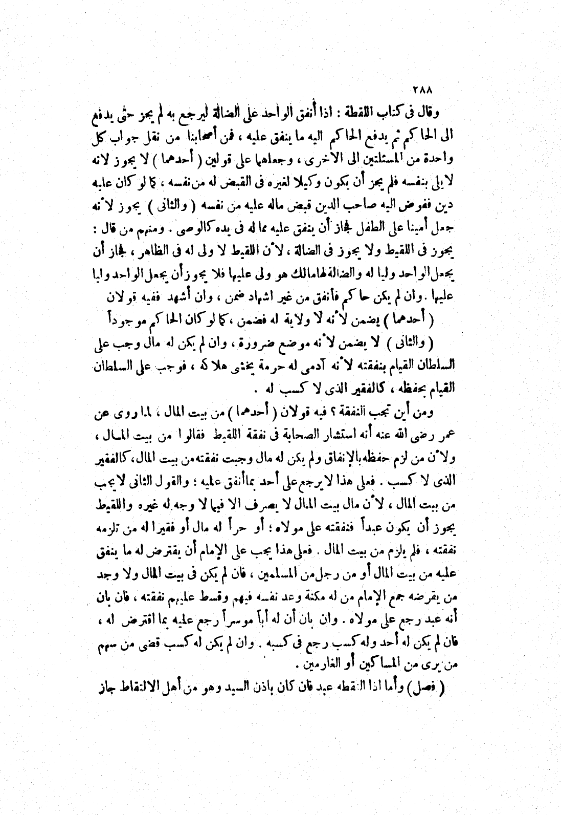 فعلى هذا لا يرجع على احد بما انفق عليه، والقول الثاني لا يجب مِنْ بَيْتِ الْمَالِ، لِأَنَّ مَالَ بَيْتِ الْمَالِ لا يصرف الا فيما لا وجه له غيره واللقيط يجوز ان يكون عبدا فنفقته على مولاه، أو حرا له مال أو فقيرا له من تلزمه نفقته، فلم يلزم من بيت المال.