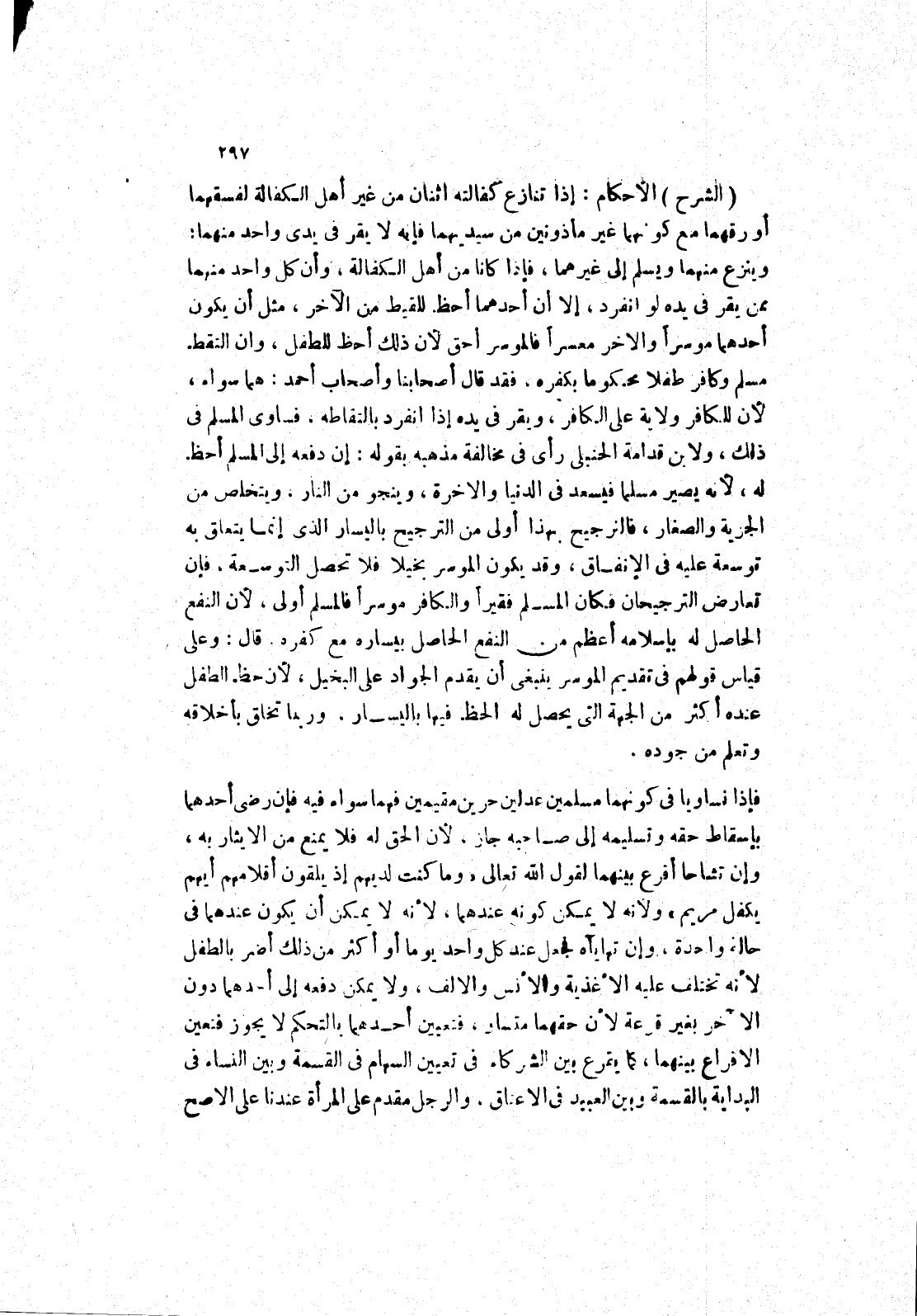 (الشرح) الاحكام: إذا تنازع كفالته اثنان من غير أهل الكفالة لفسقهما أو رقهما مع كونهما غير مأذونين من سيديهما فانه لا يقر في يدى واحد منهما: وينزع منهما ويسلم إلى غيرهما: فإذا كانا من أهل الكفالة، وان كل واحد منهما ممن يقر في يده لو انفرد، الا أن أحدهما احظ للقيط من الاخر، مثل أن يكون احدهما موسرا والاخر معسرا فالموسر أحق لان ذلك أحظ للطفل، وان التقط مسلم وكافر طفلا محكوما بكفره، فقد قال أصحابنا وأصحاب أحمد: هما سواء، لان للكافر ولاية على الكافر، ويقر في يده إذا انفرد بالتقاطه، فساوى المسلم في ذلك، ولابن قدامة الحنبلى رأى في مخالفته مذهبه بقوله: ان دفعه إلى المسلم احظ له، لانه يصير مسلما فيسعد في الدنيا والاخرة، وينجو من النار، ويتخلص من الجزية والصغار، فالترجيح بهذا أولى من الترجيح باليسار الذى انما يتعلق به توسعة عليه في الانفاق، وقد يكون الموسر بخيلا فلا تحصل التوسعة، فان تعارض الترجيحان فكان المسلم فقيرا والكافر موسرا فالمسلم أولى، لان النفع الحاصل له باسلامه أعظم من النفع الحاصل بيساره مع كفره.
