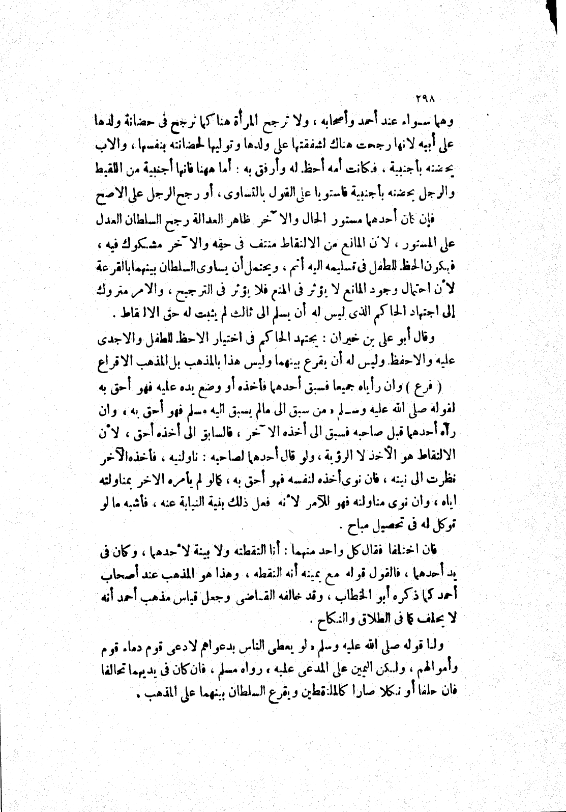 وهما سواء عند احمد وأصحابه، ولا ترجح المرأة هنا كما ترجح في حضانة ولدها على ابيه لانها رجحت هناك لشفقتها على ولدها وتوليها لحضانته بنفسها، والاب يحضنه باجنبية، فكانت أمه أحظ له وأرفق به، أما ههنا فانها أجنبية من اللقيط والرجل يحضنه بأجنبية فاستويا على القول بالتساوى، أو رحج الرجل على الاصح فان كان احدهما مستور الحال والاخر ظاهر العدالة رجح السلطان العدل على المستور، لان المانع من الالتقاط منتف في حقه والاخر مشكوك فيه، فيكون الحظ للطفل في تسليمه إليه أثم، ويحتمل أن يساوى السلطان بينهما بالقرعة لان احتمال وجود المانع لا يؤثر في المنع فلا يؤثر في الترجيح، والامر متروك إلى اجتهاد الحاكم الذى ليس له أن يسلم إلى ثالث لم يثبت له حق الالقاط.