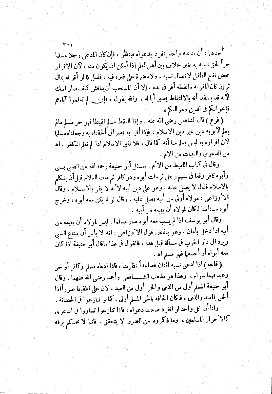 (قلت) إذا ادعى نسبه اثنان فصاعدا نظرت، فإذا ادعاه مسلم وكافر أو حر وعبد فهما سواء، وهذا هو مذهب الشافعي وأحمد رضى الله عنهما.