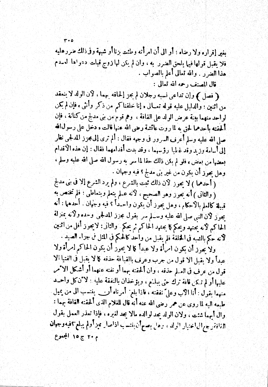 وإن تداعى نسبه رجلان لم يجز إلحاقه بهما، لان الولد لا ينعقد من اثنين، والدليل عليه قوله تعالى (إنا خلقناكم من ذكر وأنثى) فإن لم يكن لواحد منهما بينة عرض الولد على القافة، وهم قوم من بنى مدلج من كنانة، فإن ألحقته بإحدهما لحق به لِمَا رَوَتْ عَائِشَةُ رَضِيَ اللَّهُ عَنْهَا قَالَتْ (دَخَلَ عَلَى رَسُولِ اللَّهِ صَلَّى اللَّهُ عَلَيْهِ وَسَلَّمَ أعرف السرور في وجهه فقال: ألم ترى إلى مجزز المدلجى نظر إلى أسامة وزيد وقد غطيا رؤسهما، وقد بدت أقدامهما فقال: إن هذه الاقدام بعضها من بعض) فلو لم يكن ذلك حقا لما سر بِهِ رَسُولُ اللَّهِ صَلَّى اللَّهُ عَلَيْهِ وَسَلَّمَ، وَهَلْ يجوز أن يكون من غير بنى مدلج؟ فيه وجهان.